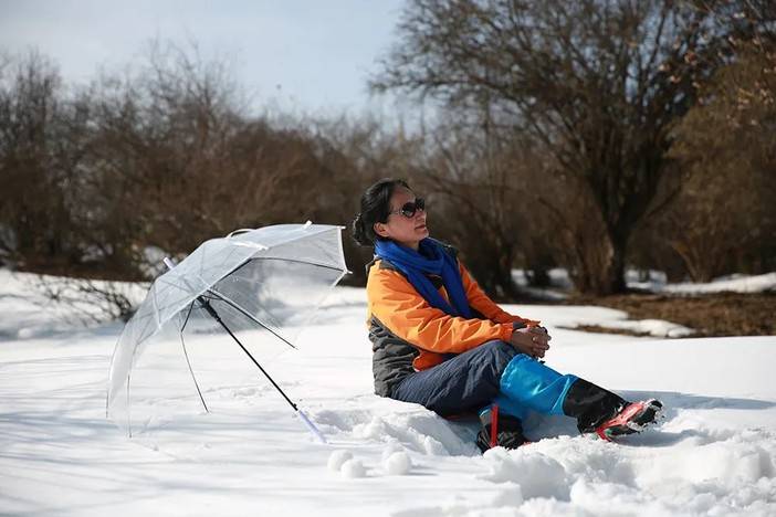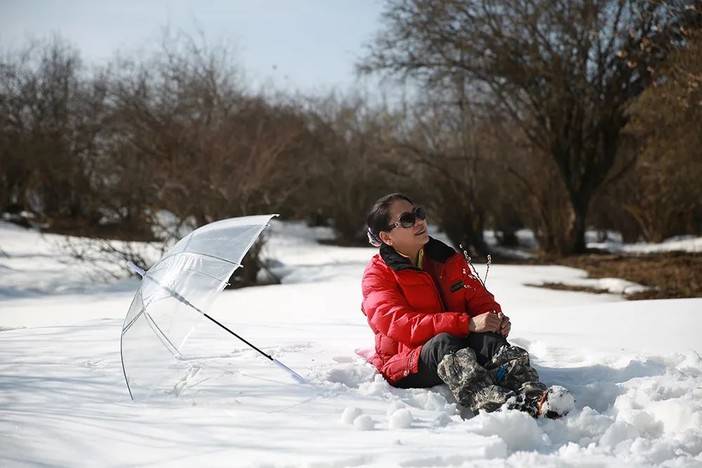 路边、树梢、山巅,雪毫不吝惜自己的踪迹,暖色阳光下,纯净的白雪已经挂满枝桠。