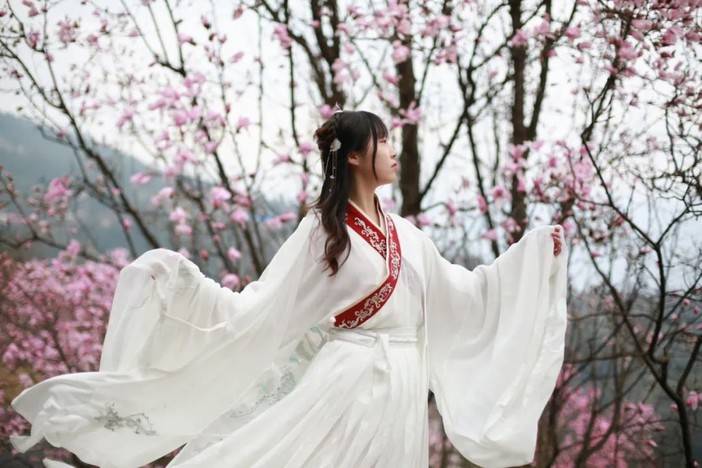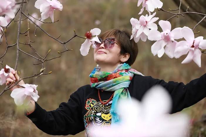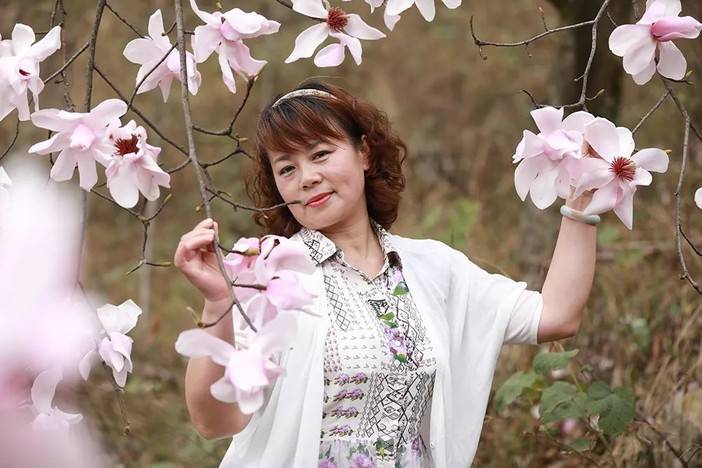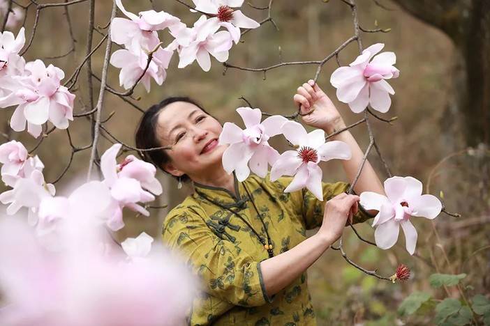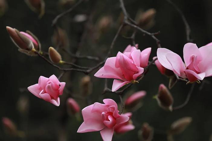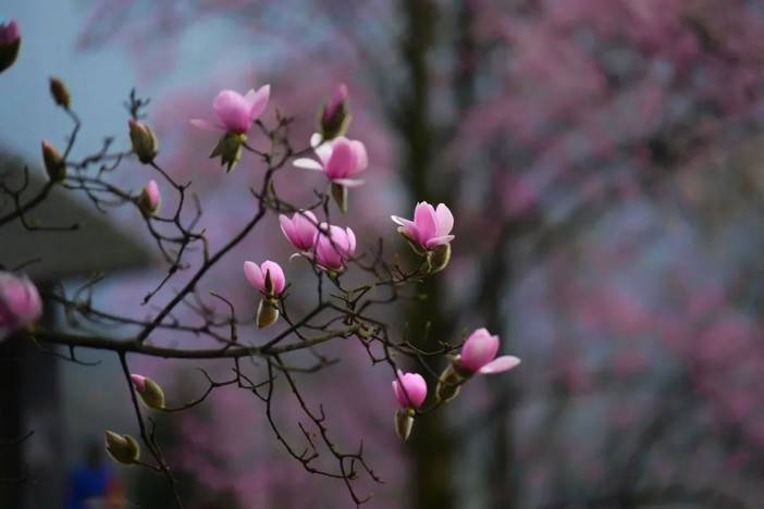 辛夷花片片轻柔的花瓣,犹如晚宴上女子的妆容,细柔的枝干犹如纤细的腰肢,使得四周春意盎然。
