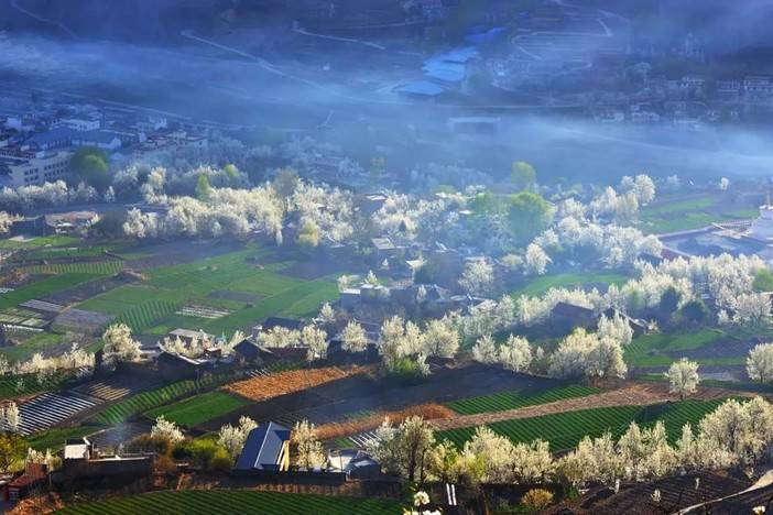 阵阵春风吹过绽放枝头的花瓣随风飞舞,花瓣在春风的“轻抚”下,缓缓散落,媚而不俗,高雅通透。