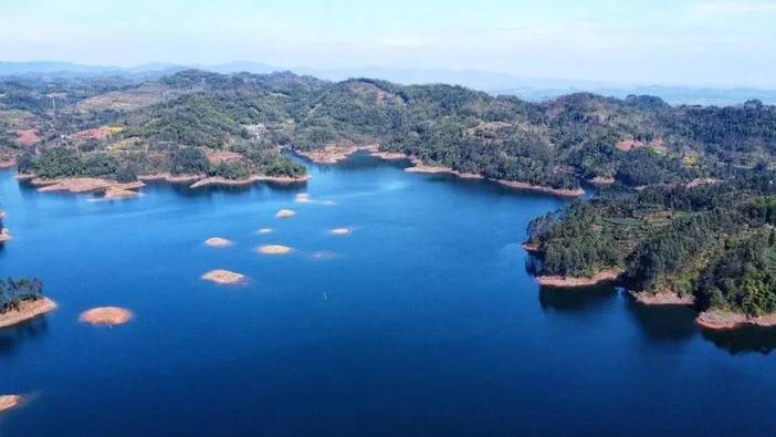 湖岸曲折蜿蜒,小岛坐落其间,湖光山色,淡雅宁静。沿青山一路蜿蜒而下的和风,轻柔地抚摸着湖水,仿佛连心都宁静了。