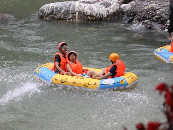 前方即将到达本行程第一个平缓水域,在这里可以看到诸多的漂流队伍随水流飘荡,顺势而下,船上的朋友都在不停地凹造型。