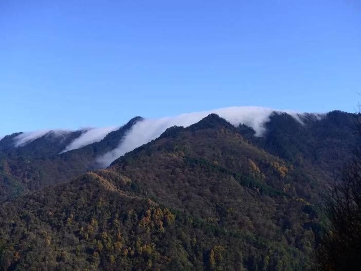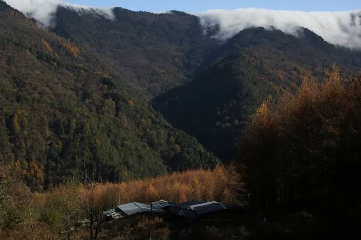 十一月,正当秋色正浓,寒风欲来之时,甘海子的美也在此时凸显出来,层层叠叠的山峦被裹上了秋衣,高耸的山峰被云海环绕,连笔挺的林木都穿上了彩衣。