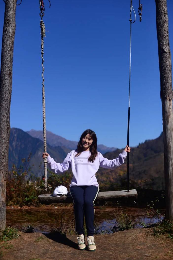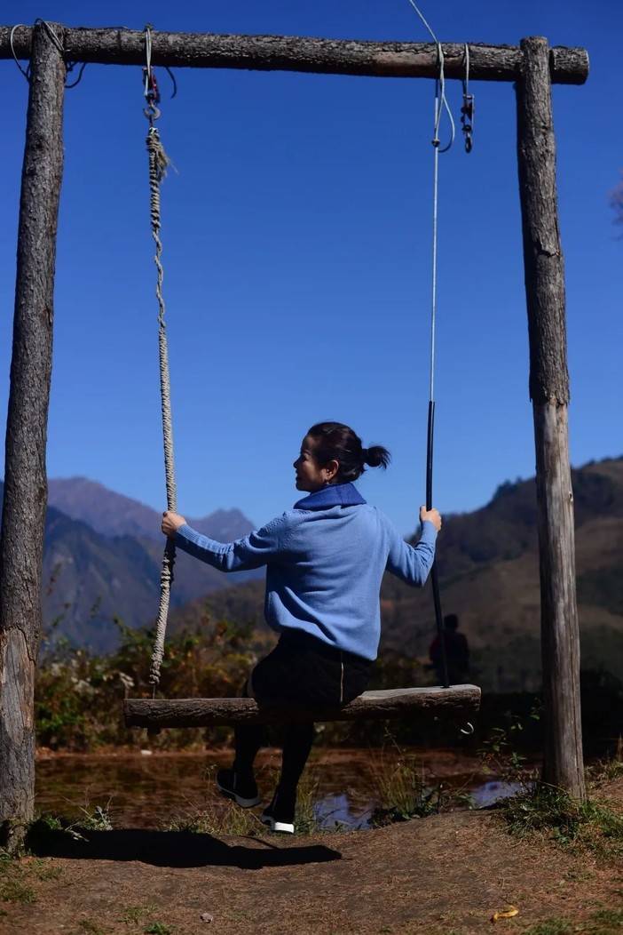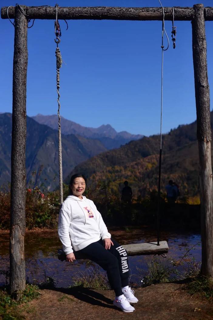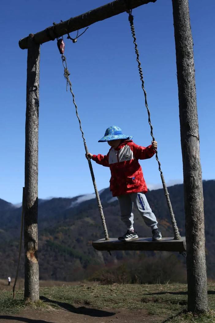 当彩林做了背景,山河皆在脚下,头上的蓝天也变得触手可及,在这高山观景台的秋千上,留下一一个个美丽的笑颜。