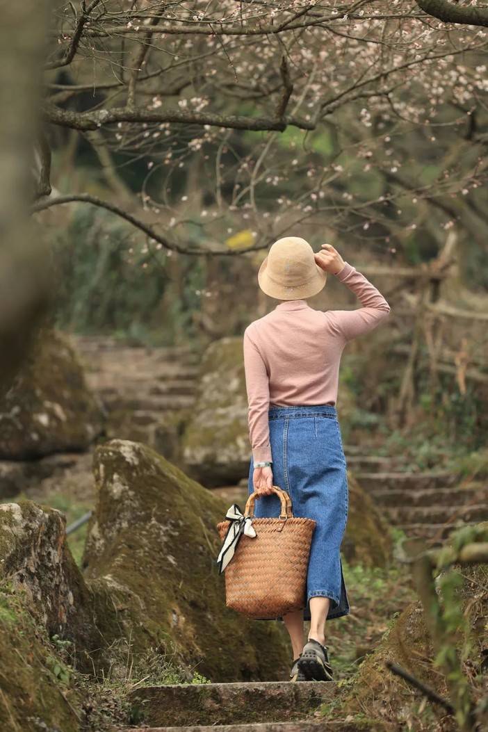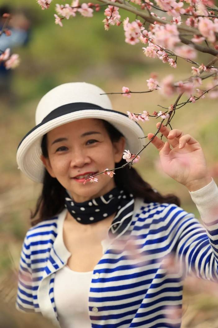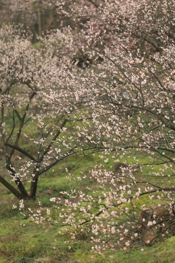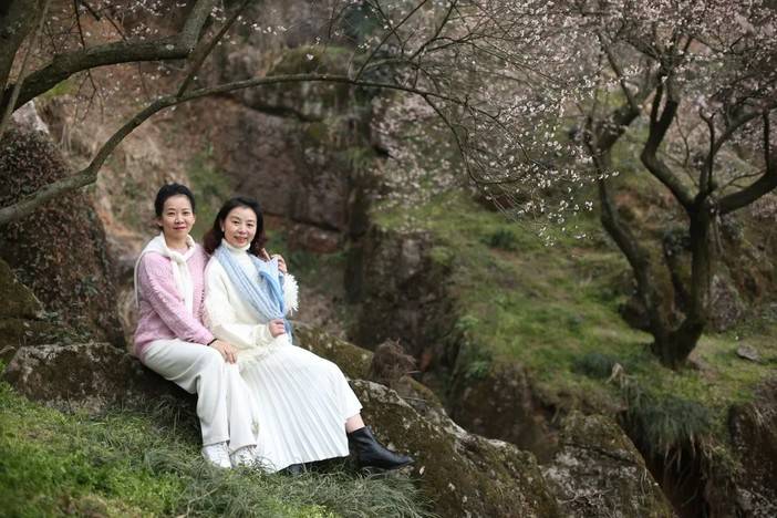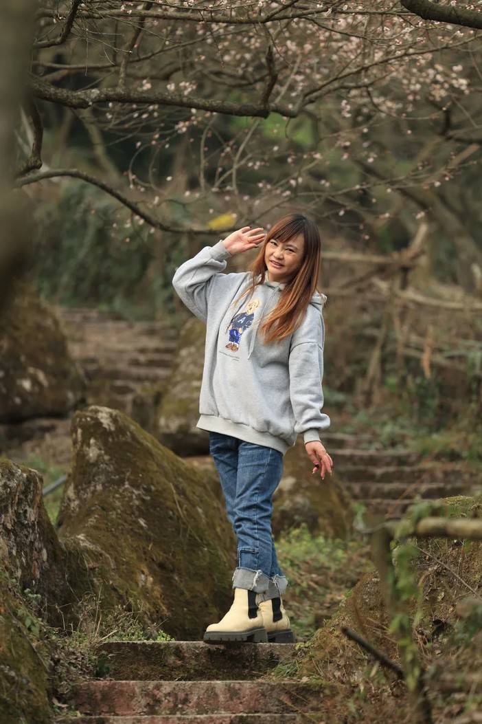 微风拂过,有星点梅花往下落。古老的山路,裹着青苔的山石引着人向上攀爬,花香铺满来路,欢声笑语划破空气回荡在半山腰。