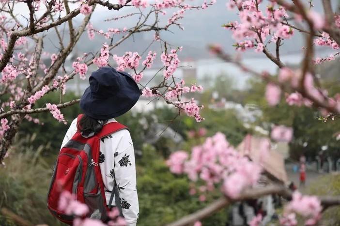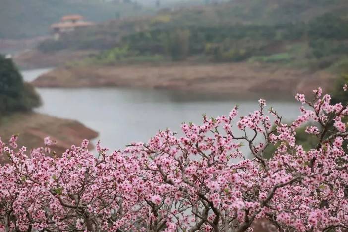 梅湾湖春光正好,桃花漫山遍野,绕着湖岸盛开,整个湖泊看起来如梦似幻,天光云影共徘徊,山间粉黛次第开,清波涟涟与狡黠的春日交相辉映。