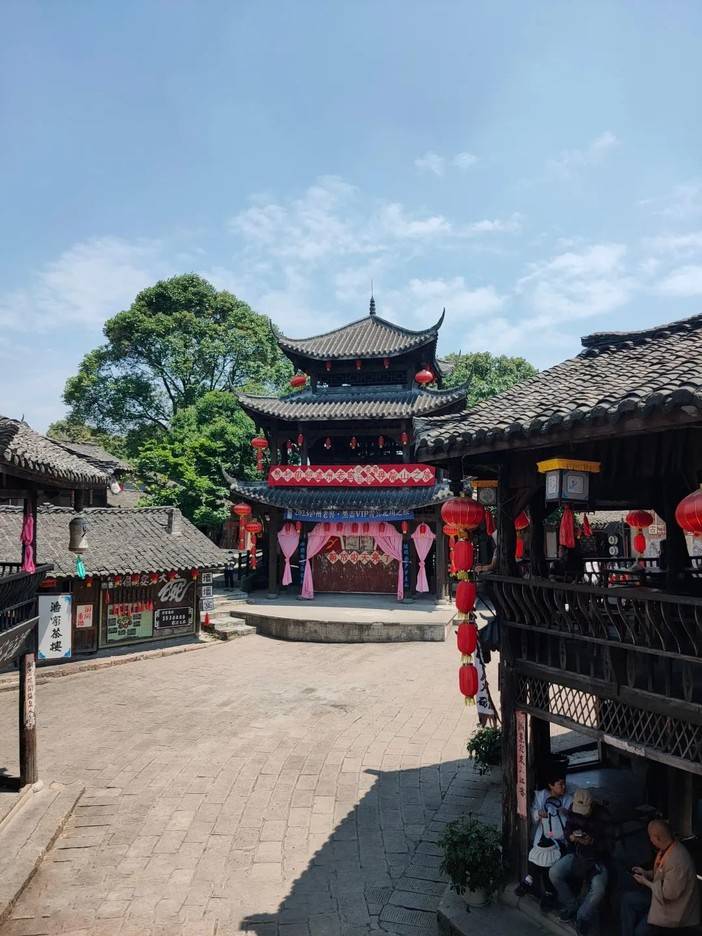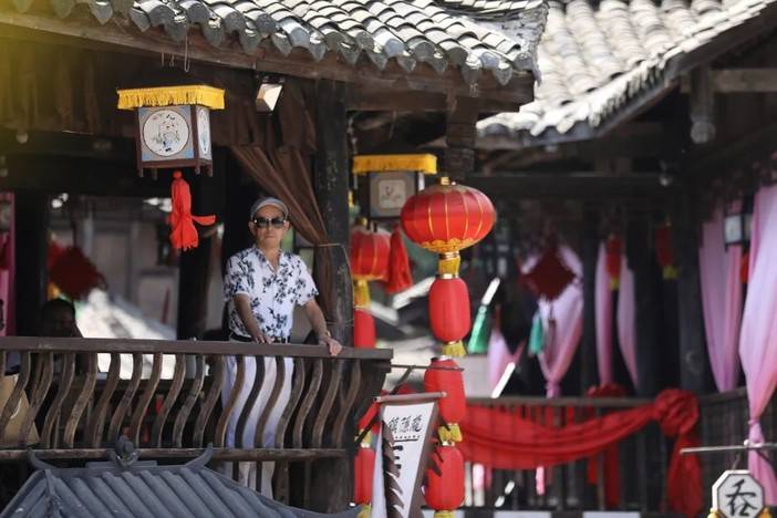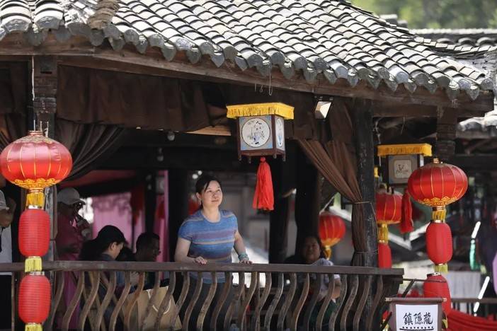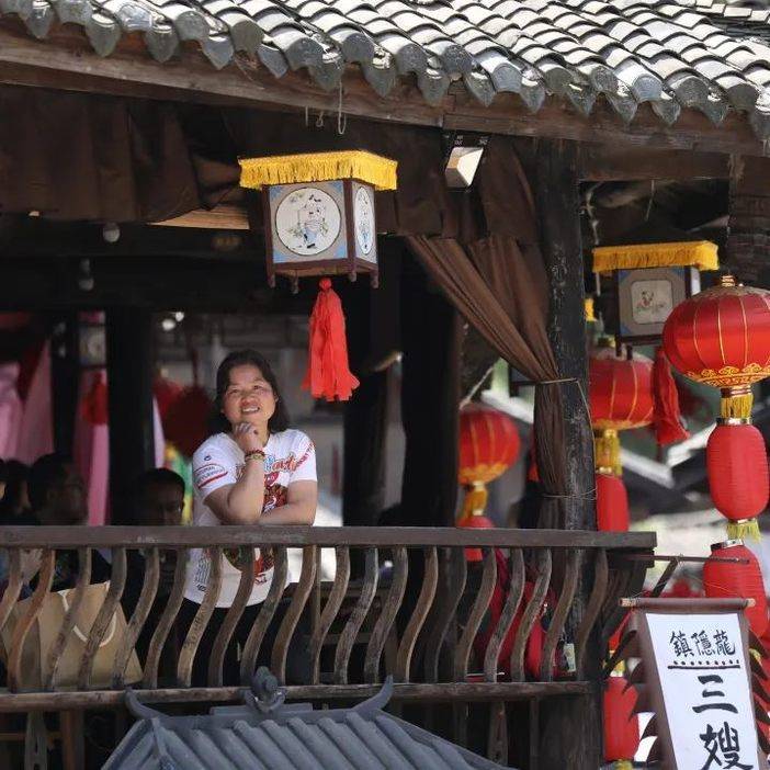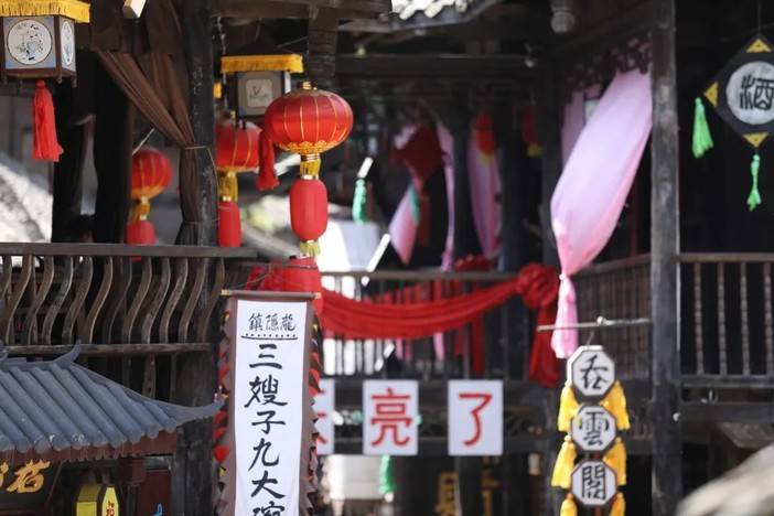 招亲抛绣球的凉亭高驻,红绸将姻缘牵起,天下第一保的牌匾将人一下带进了电视剧中,镂空的木梯是记忆中珍藏已久的画面,“斗地主”的表演更是给人沉浸式体验。