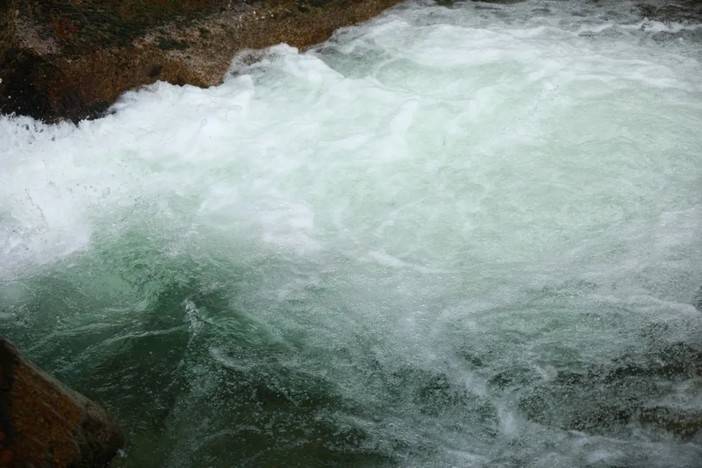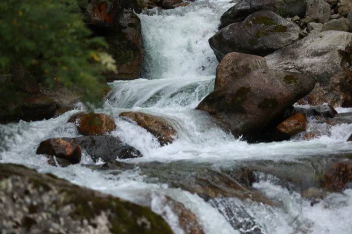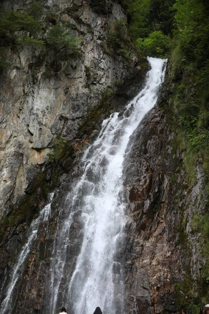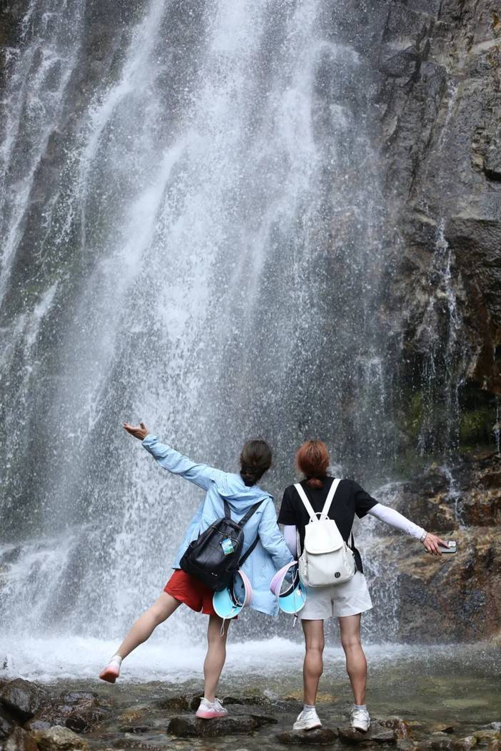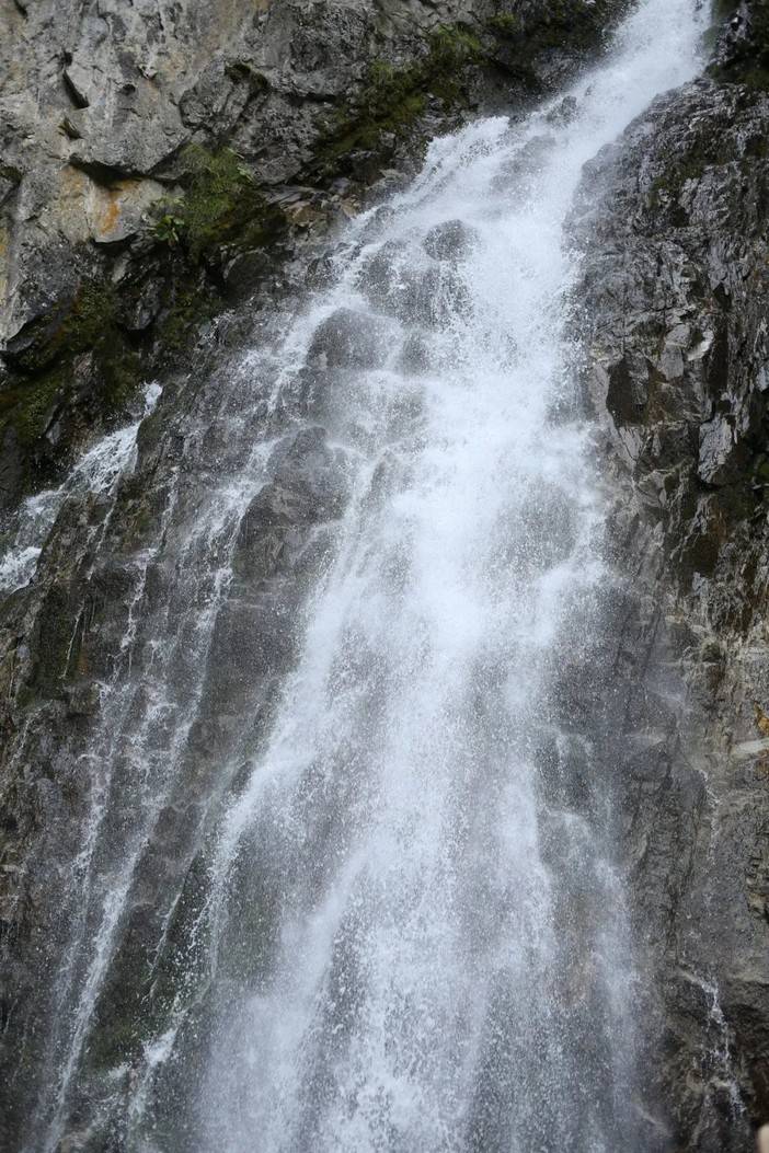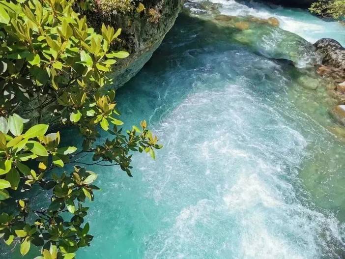正值丰水期,厄尔娜沟的水流湍急,平时宁静优美的小水潭此刻迸发出汹涌的水雾,像是一块从内部破裂的翡翠,泛出冰绿色,看起来很是舒服。