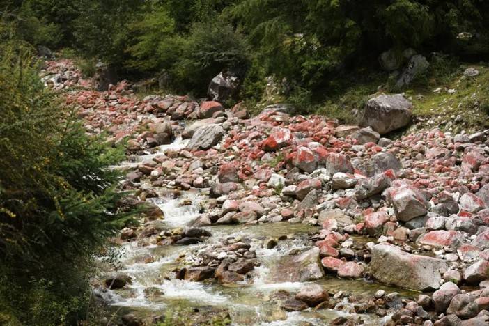 踩过锈迹斑斑的小桥,我们在桥上看了一幅红石堆砌的奇特画面,红石滩将水流分离,细碎的河水在低处汇合,往下游奔去,那上游是什么呢?