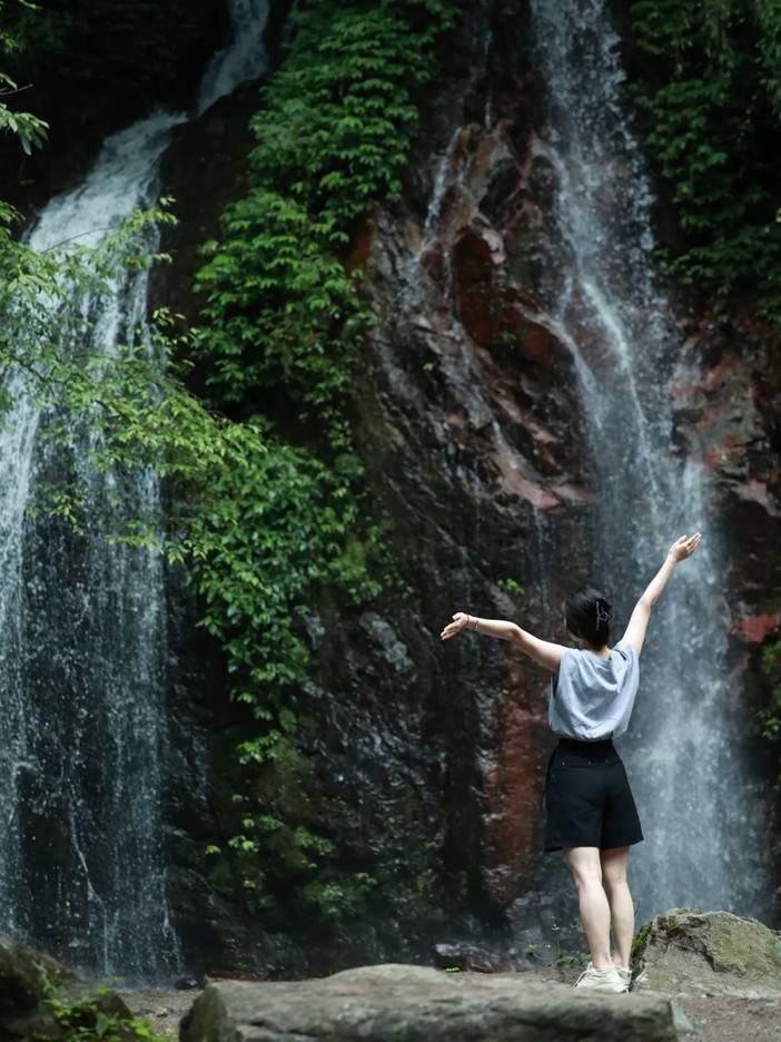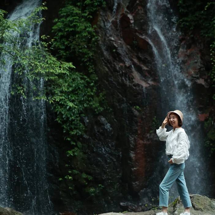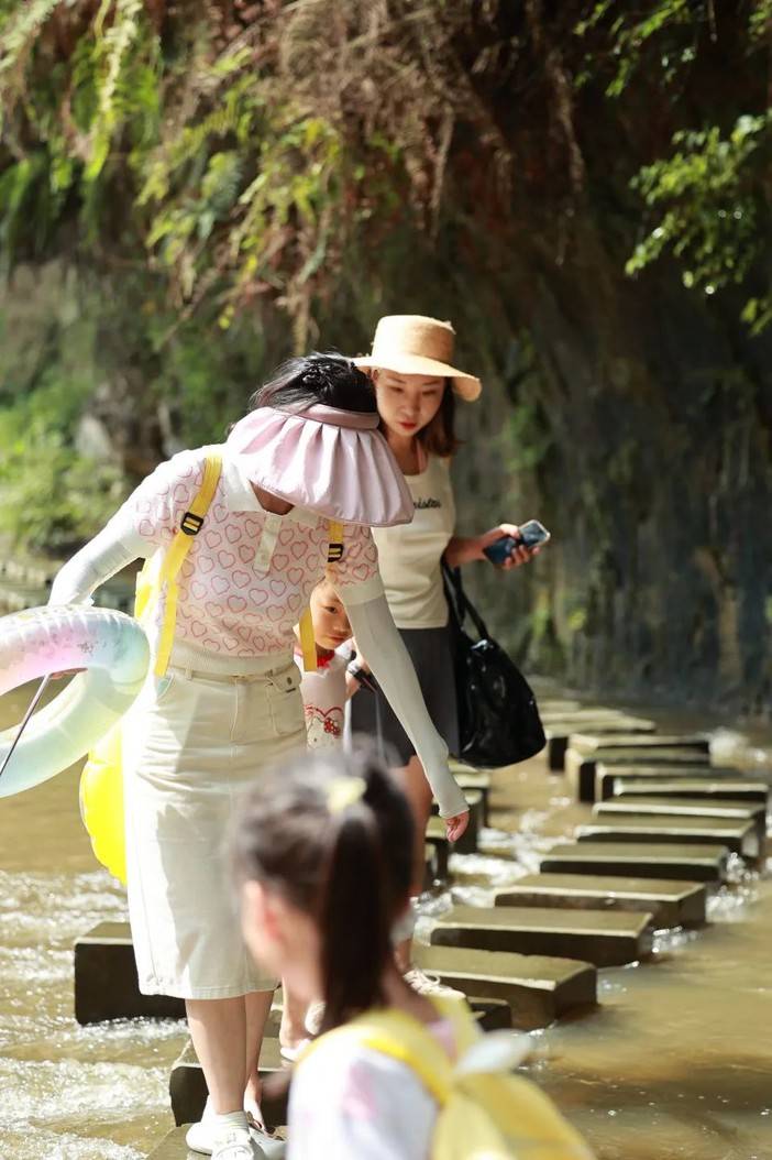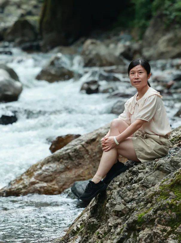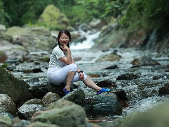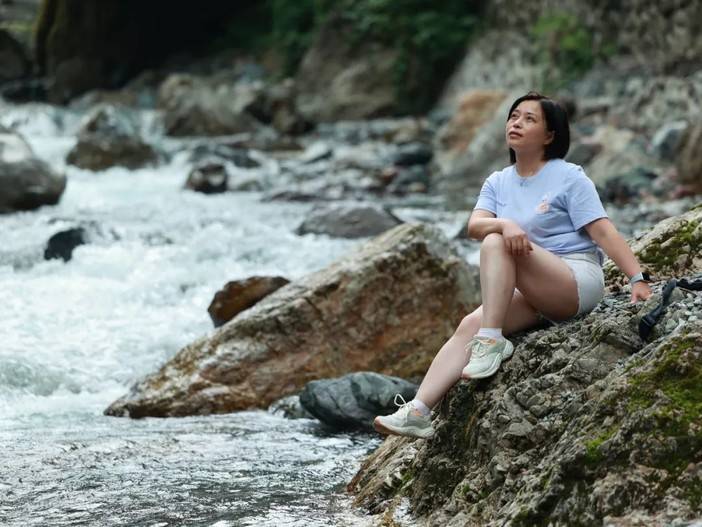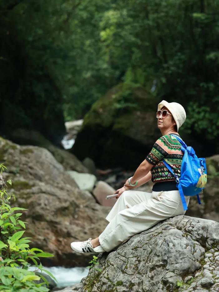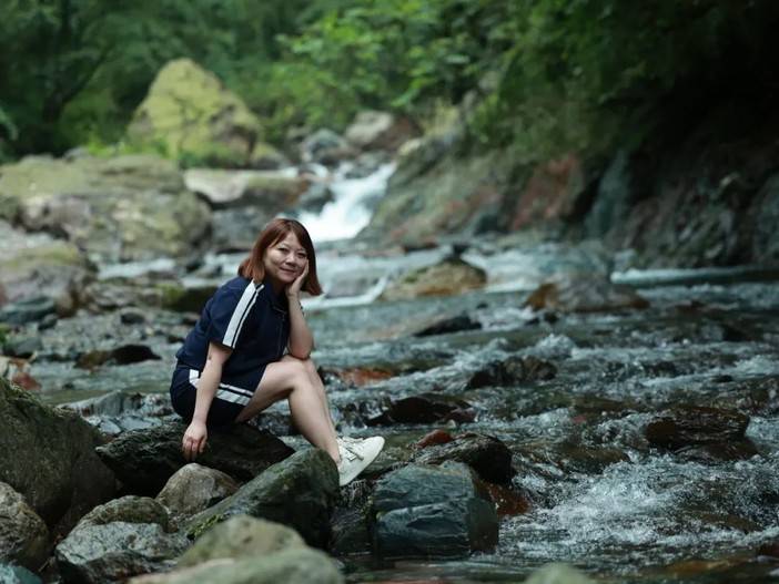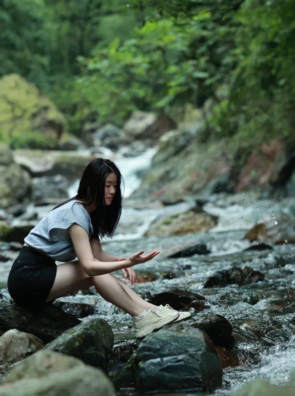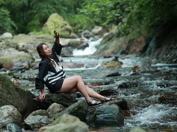 深浅不一的河石井然有序,山间蝉噪水鸣,热闹非凡。随意坐下摆个姿势,就能借助光影与布景快速出片,耳边是水流撞击河石形成的叮咚声,听着内心只觉畅意非凡。