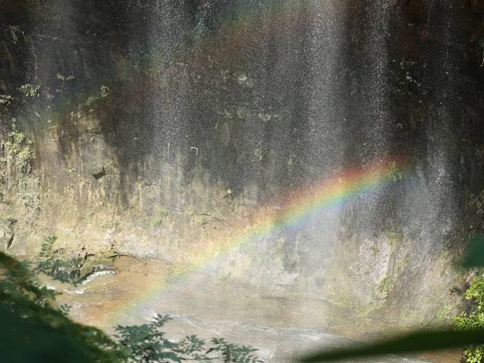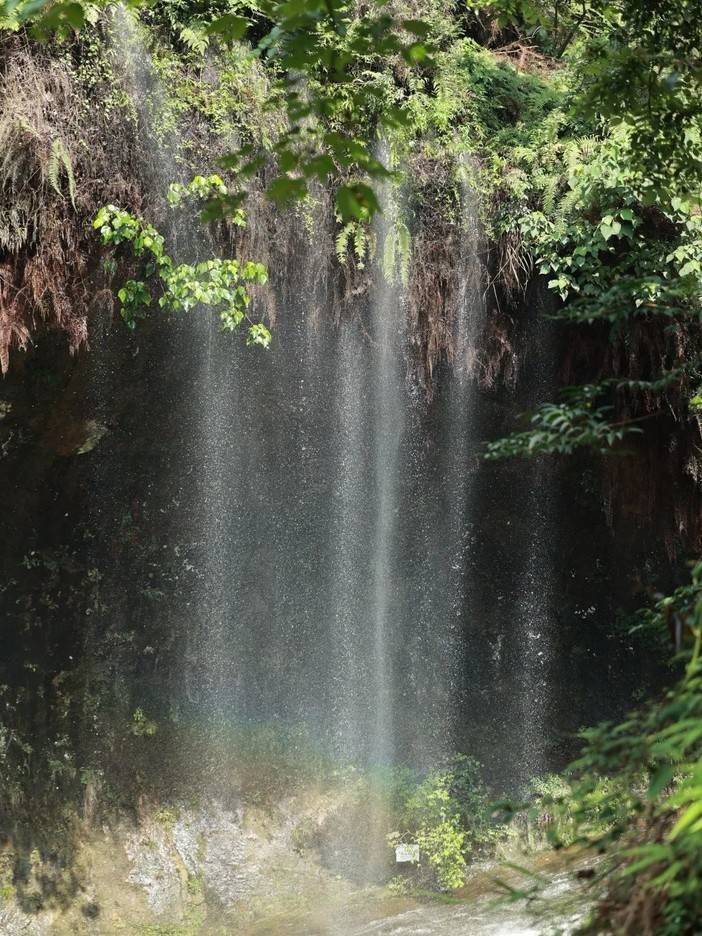 一路向上来到水帘飞虹,水流潺潺挂在崖壁,像是一张轻纱,轻薄剔透,在阳光的作用下水珠纷纷跳起舞来,水雾冥冥中彩虹也跨越而来,形成一道美丽的风景线。