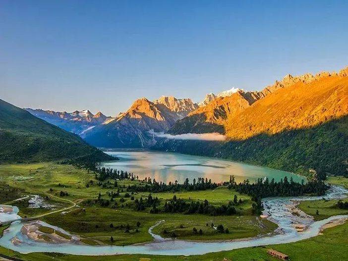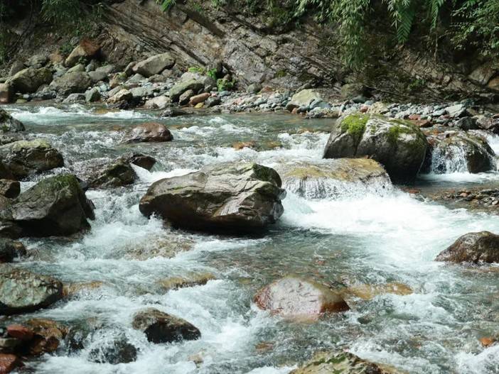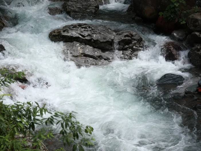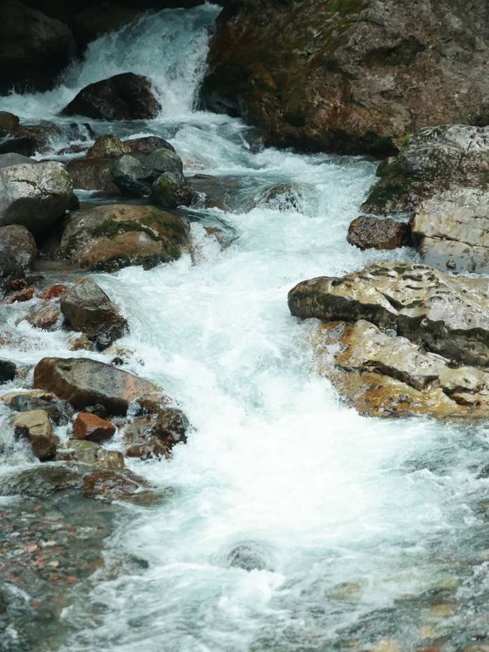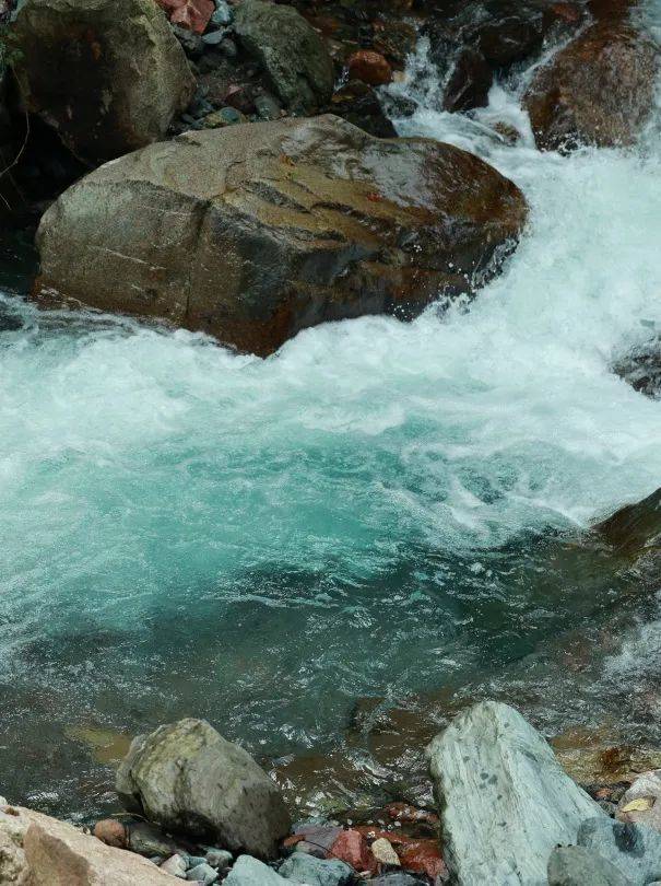大飞水的河床由许多碎石铺就而成,中年累月形成了它自己的浅滩,地势陡峭水流湍急,稍微平缓的地势中水面称翡翠色,很是好看。