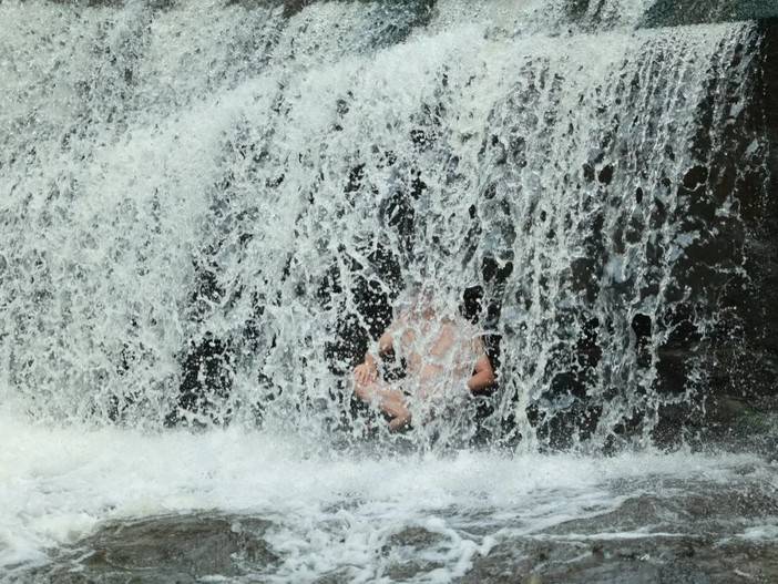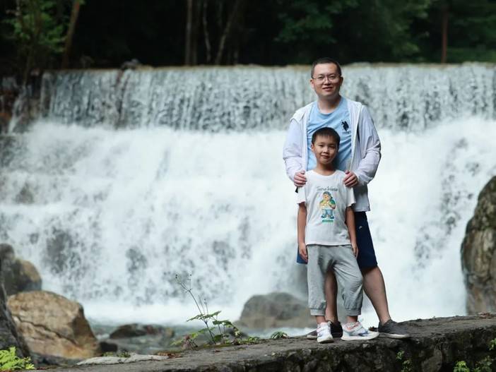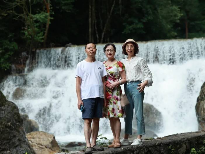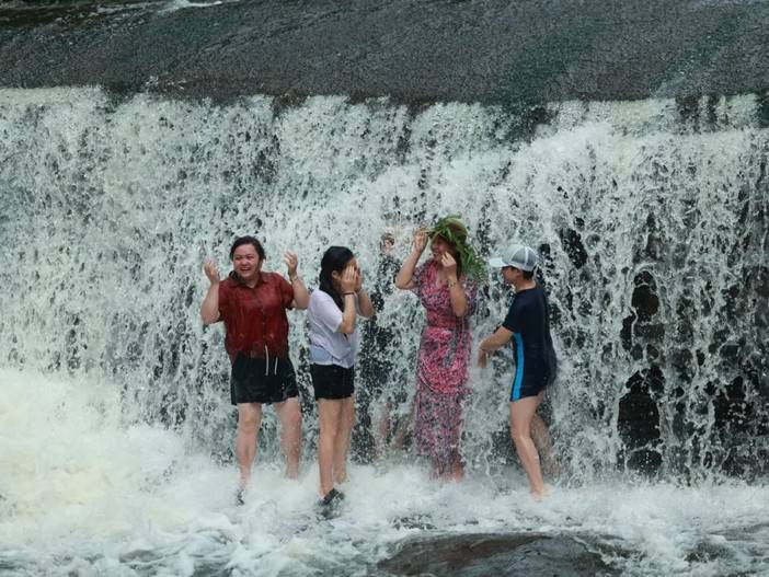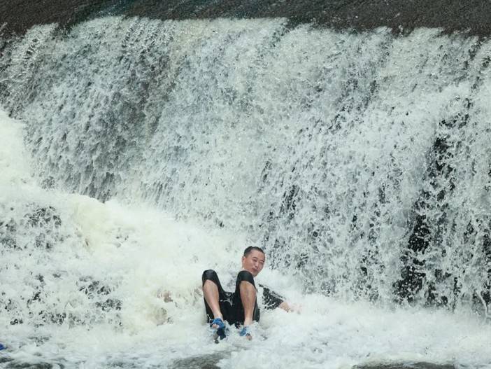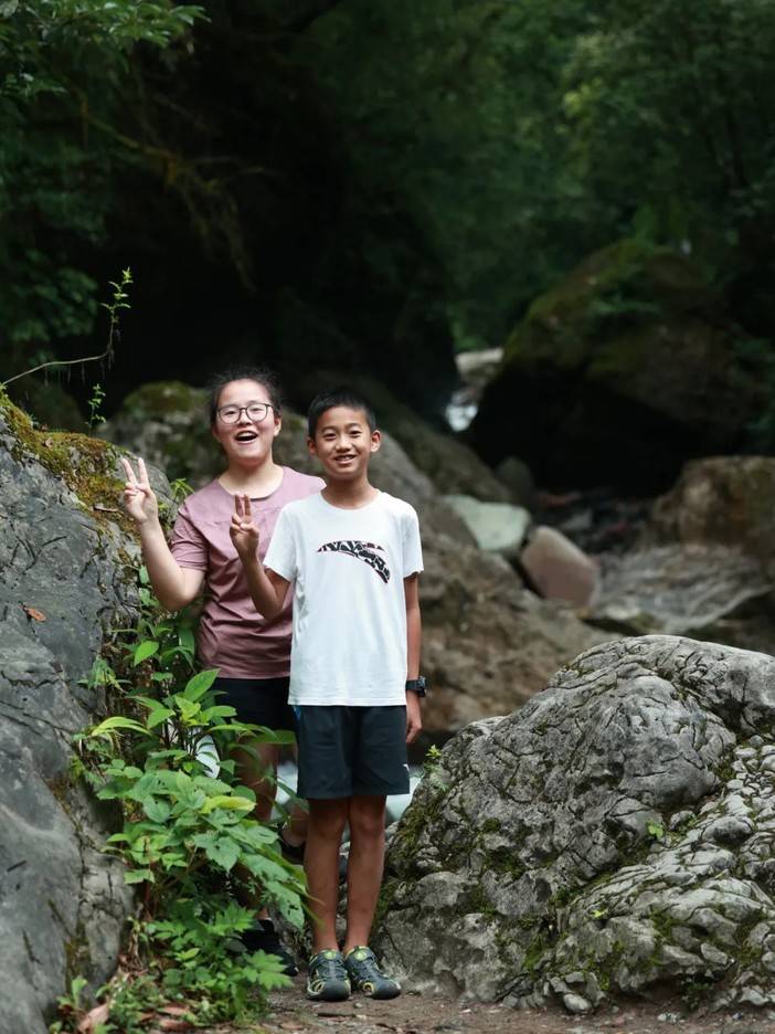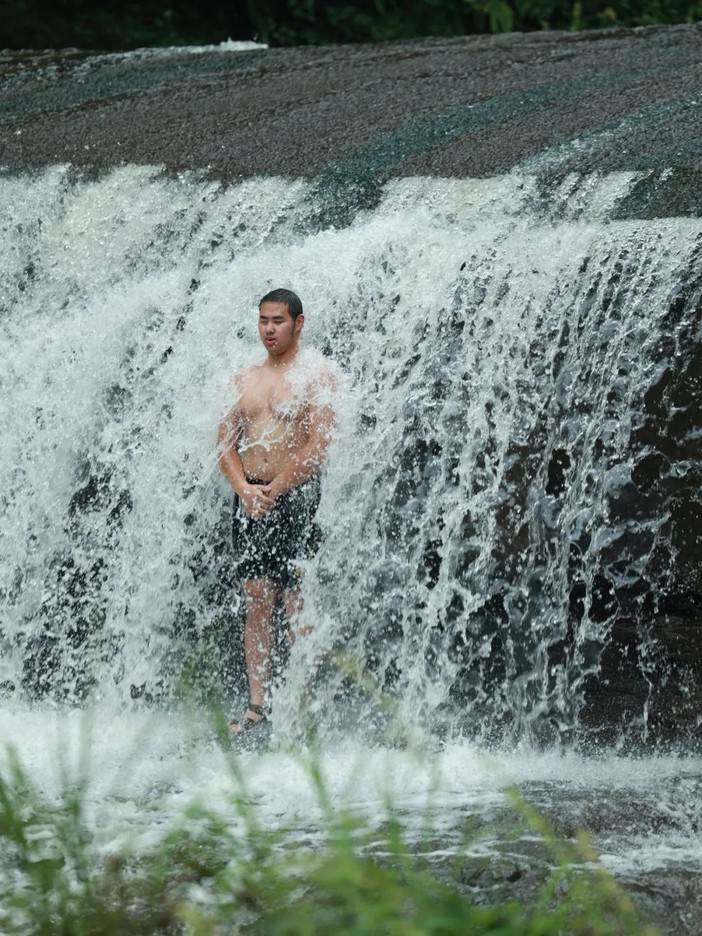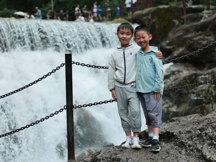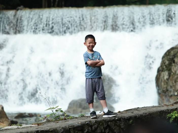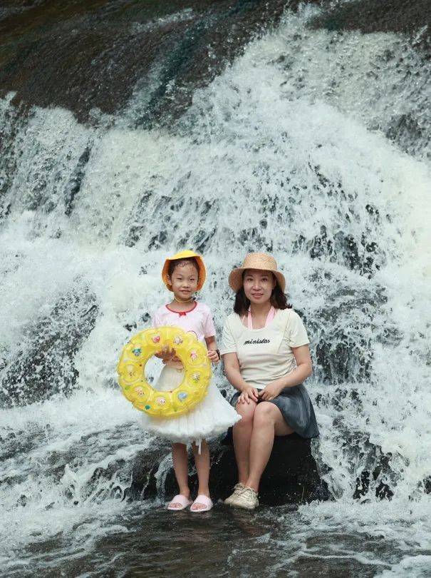响滩子瀑布的水流很是湍急,但平缓的石板河床容得人凑近去玩,层层水流奔涌而下,划过我们的衣角,在盛夏时节,真的很凉快,小朋友们也玩得很开心。
