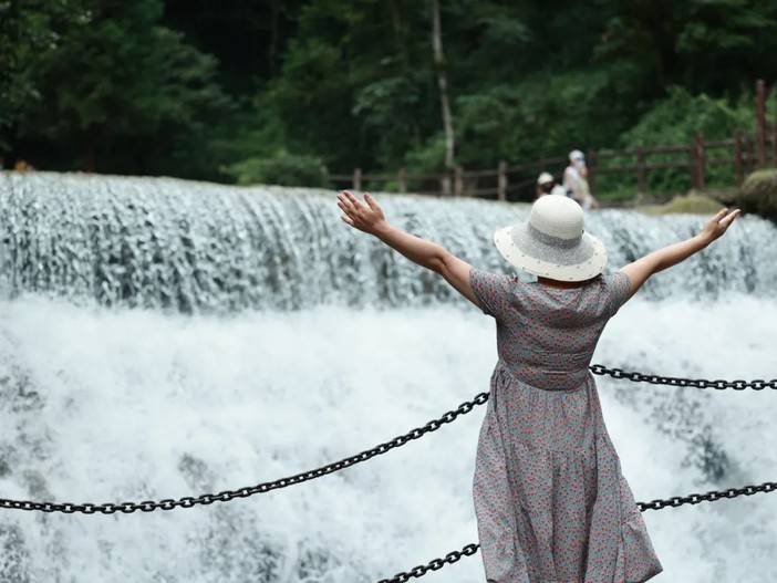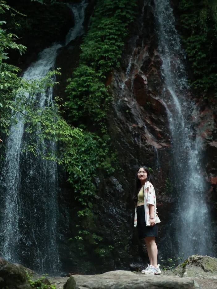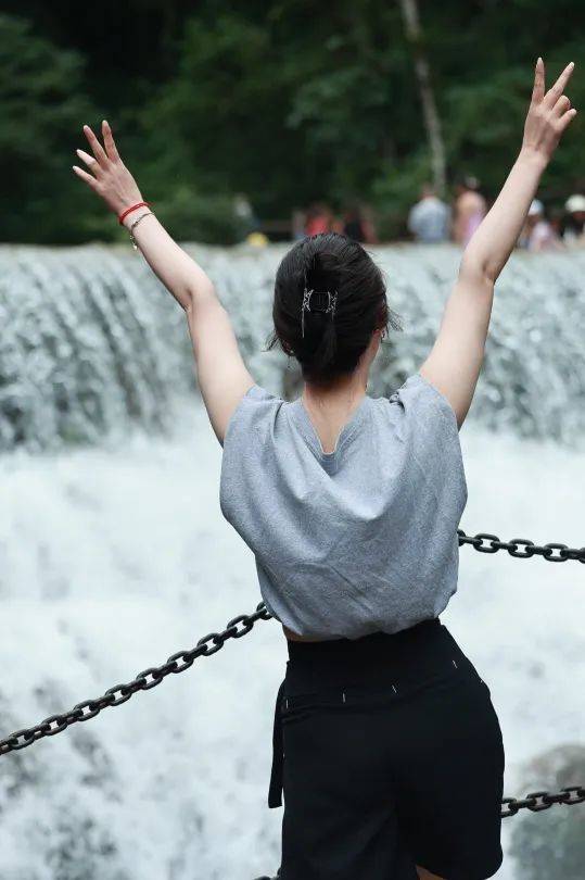 激昂的水珠四处飞溅,一路向上,湍急的水流将我们隔绝在铁链之外,幽幽一线天从崖上飞涌而下,崖壁上的绿植将这一方天地妆点成世外桃源,氛围感直接拉满。