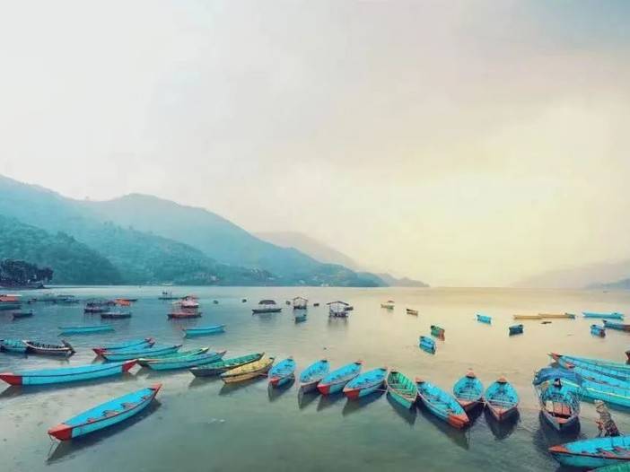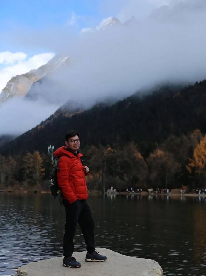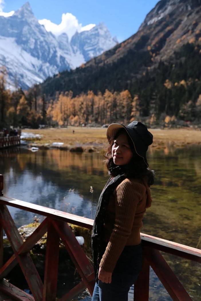 朱红的栏杆泛起陈旧的色彩,在木桥上可以将雪尖与青山做背景,蓝天清透倒影水面,红枫也来作陪,踏上湖边的河石,有种“且夫天地之间”的广阔感...