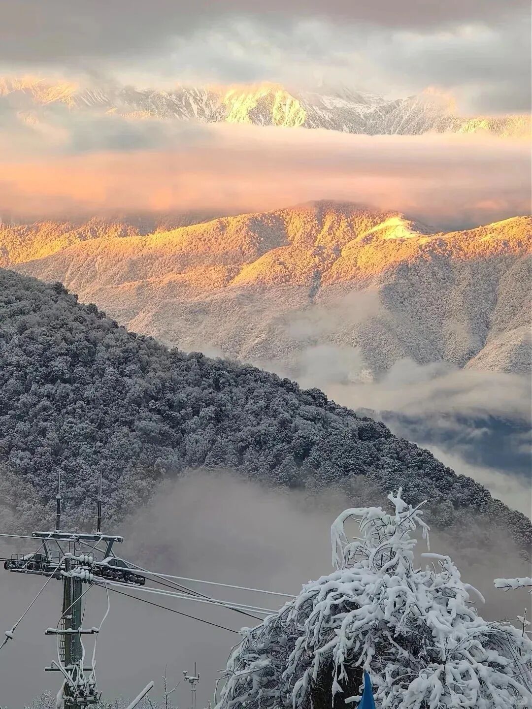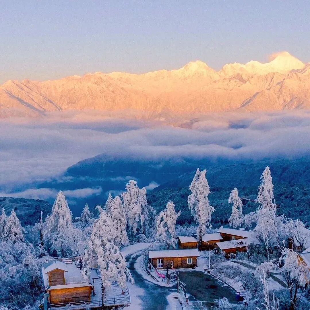 海拔3200米的王岗坪,是距离贡嘎主峰仅42公里的天然观景台。站在360°全透玻璃平台上,蜀山之王如一座巨大金字塔破云而出,晨曦点燃雪顶,金辉沿冰川倾泻。