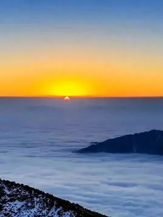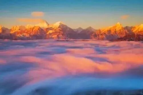 ✦ 随着太阳的升起,云海渐渐散去,日照金山的奇景映入眼帘。金色的阳光洒在远处的雪山之巅,将雪山染成一片金黄。那光芒,如同希望的火焰,照亮了整个天地,也让人豁然开朗。