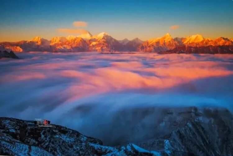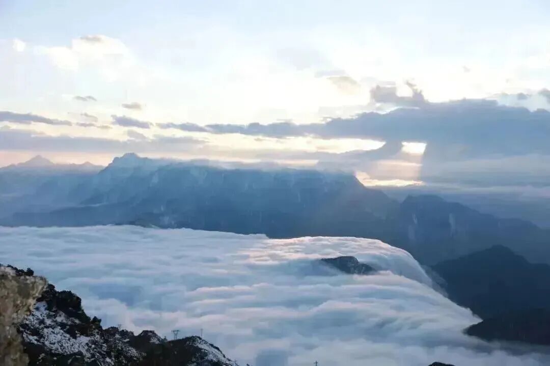 云海在脚下 2000 米处翻腾,像有人把牛奶倒进川西的盆地模型;第一抹橘红出现,温度 -8 ℃,哈气成霜,却正好给镜头蒙上一层天然柔光,翻涌成海的云将苍穹划分为两个极致空间。