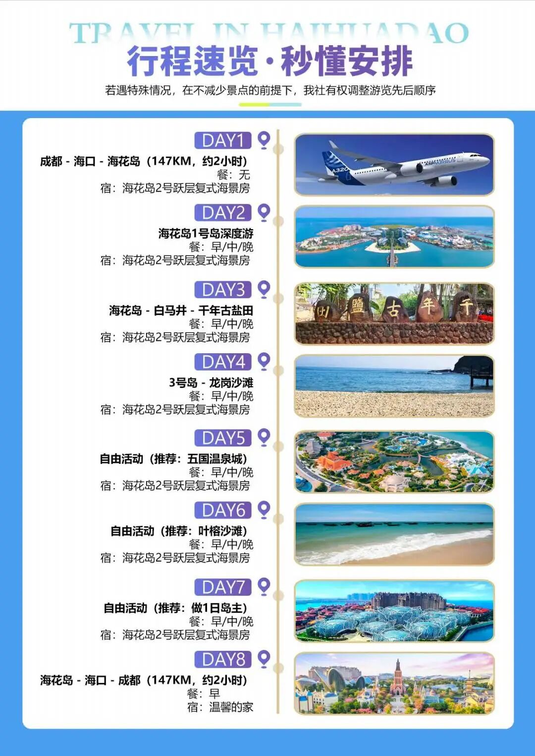 4.餐食:全程7早12正餐,餐不用不退,海花岛康养餐(五菜一汤)分餐制