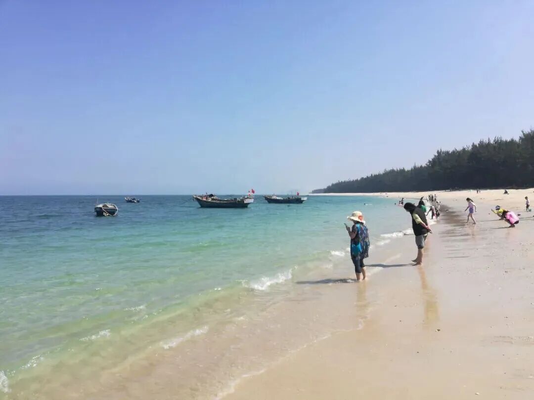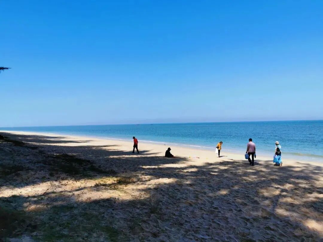 【叶榕沙滩】: 位于海南省儋州市排浦镇叶榕村边,西临北部湾,距海花岛旅游综合体 9 公里 。岸边有 宽 300 多米的木麻黄海防林,沿着海岸线蜿蜒分布。在海防林的护佑下,阳光温和、波浪平缓,海水会 随着阳光的照射呈现出五彩斑斓的颜色,景色十分美丽。