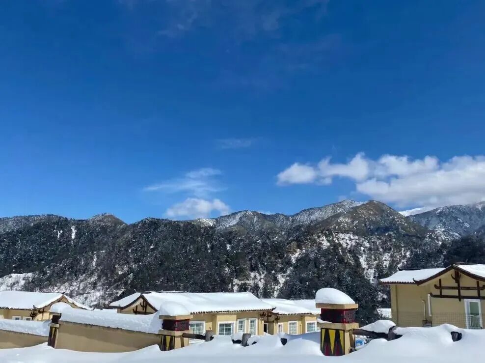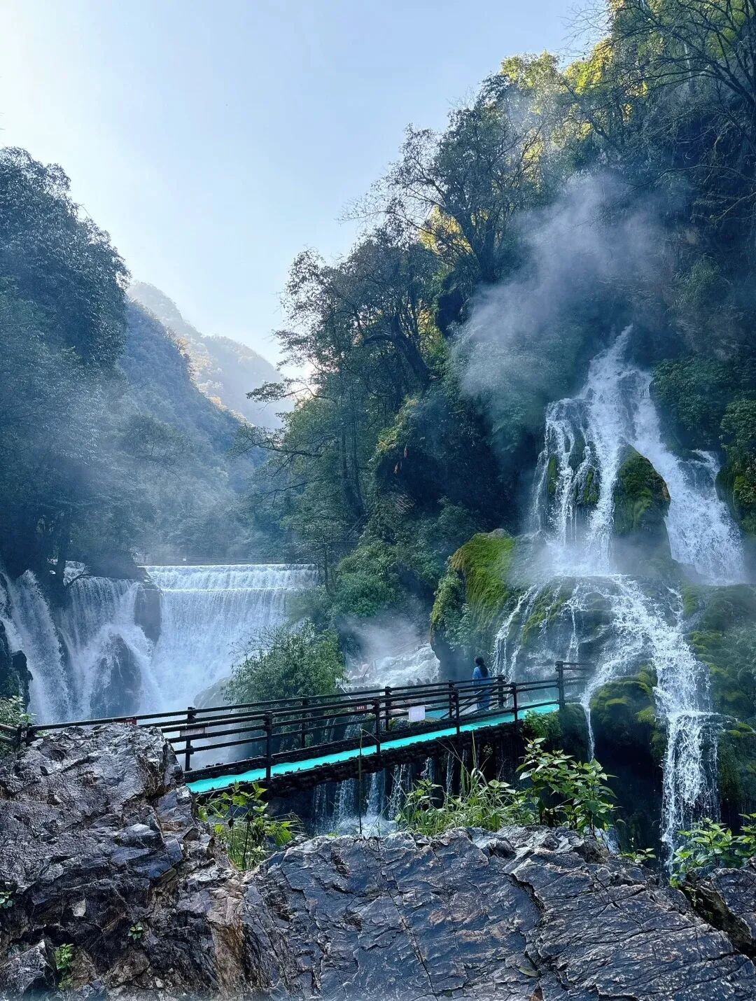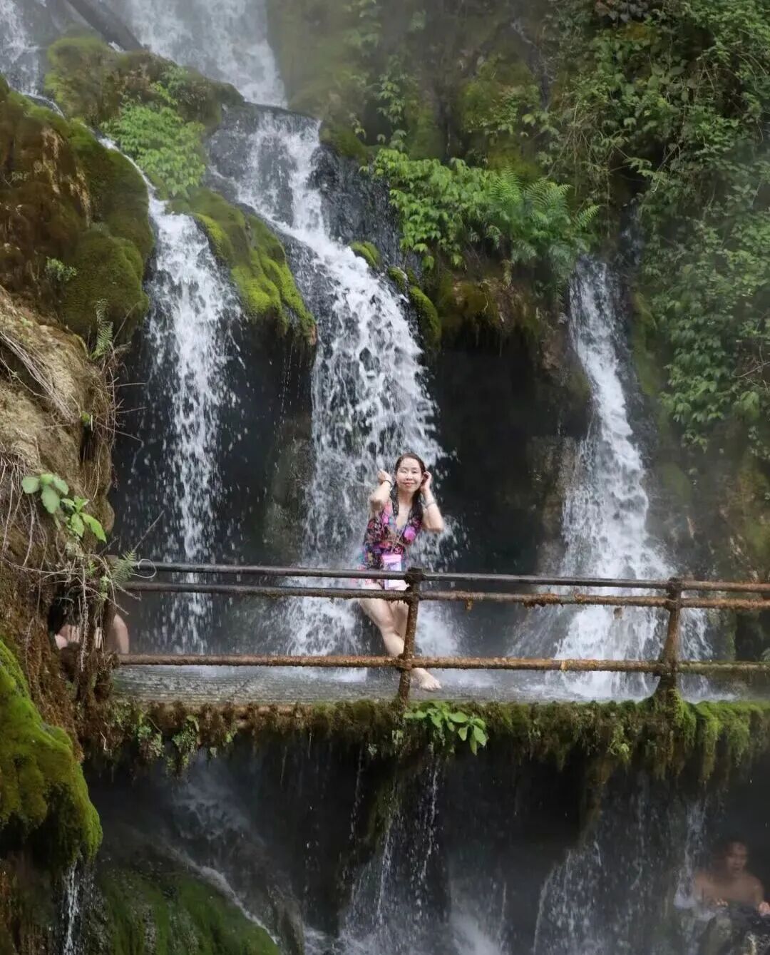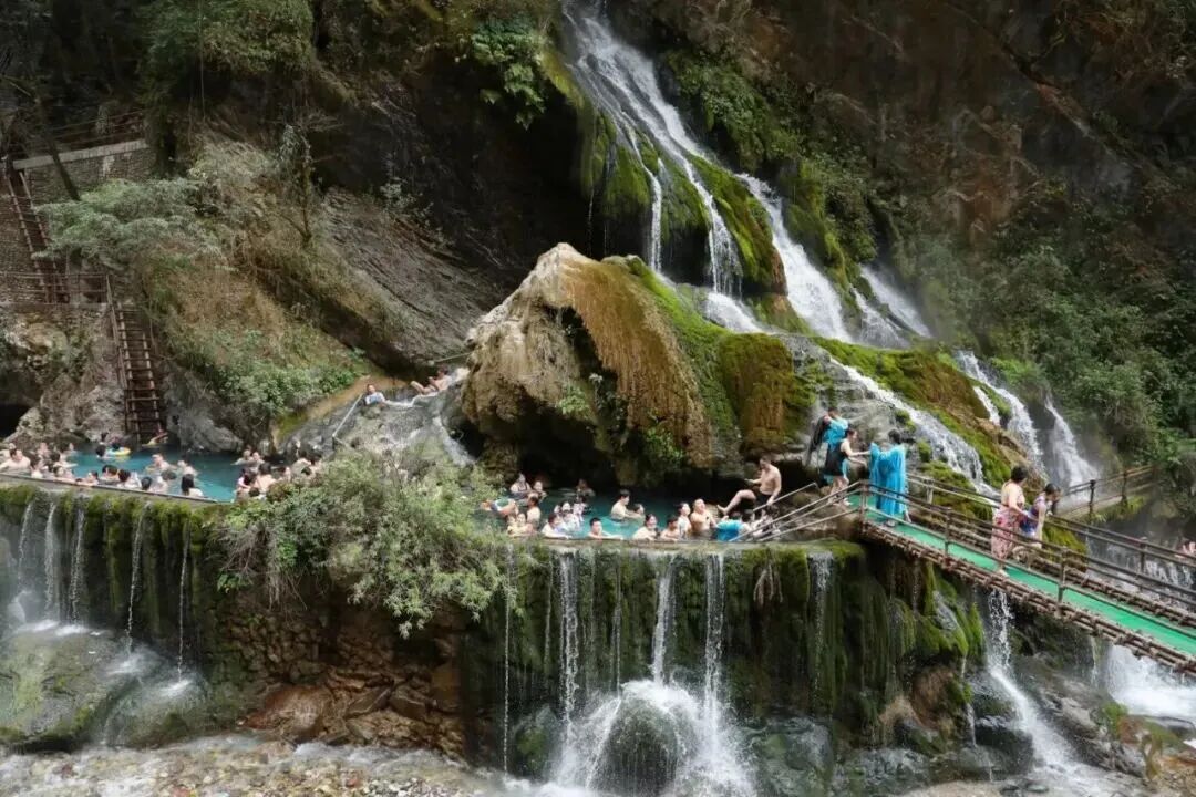 沿栈道上行,瀑布温泉段落差达50m,泉水在岩壁形成钙华幕,雪片落进热瀑即刻化雾,像给雪山加了一条会呼吸的白纱。夜泡露天池,抬头可见螺髻山雪线与星空同框。