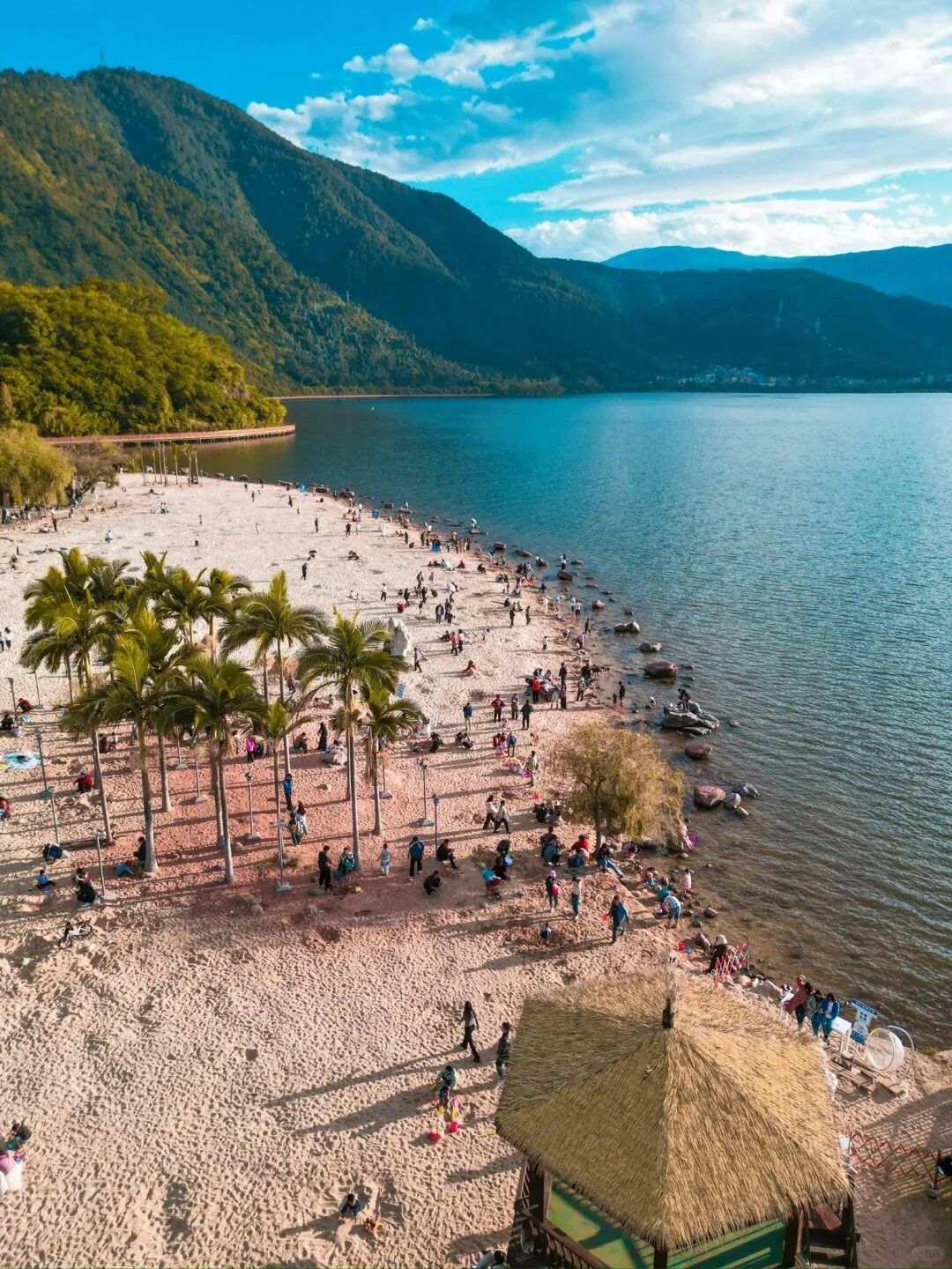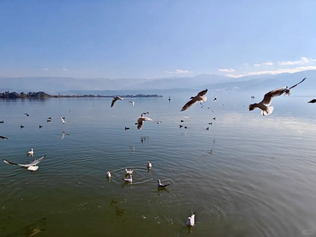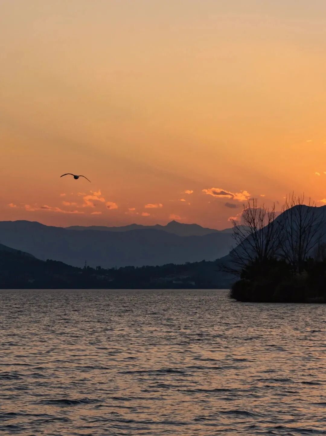 骑上湿地单车道,红嘴鸥掠过水面,翅尖撩起碎金;岸边冬樱与三角梅错季盛放,像给高原湖泊镶上一条彩色裙边。傍晚逆光拍摄,云影与山影对称倒立,仿佛整座邛海被折成一面天空之镜。