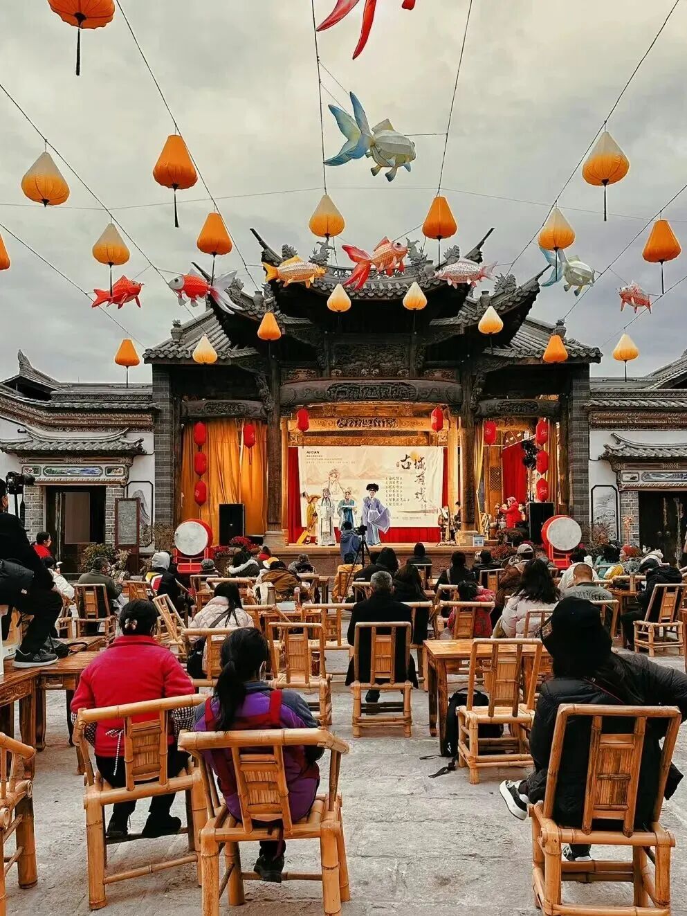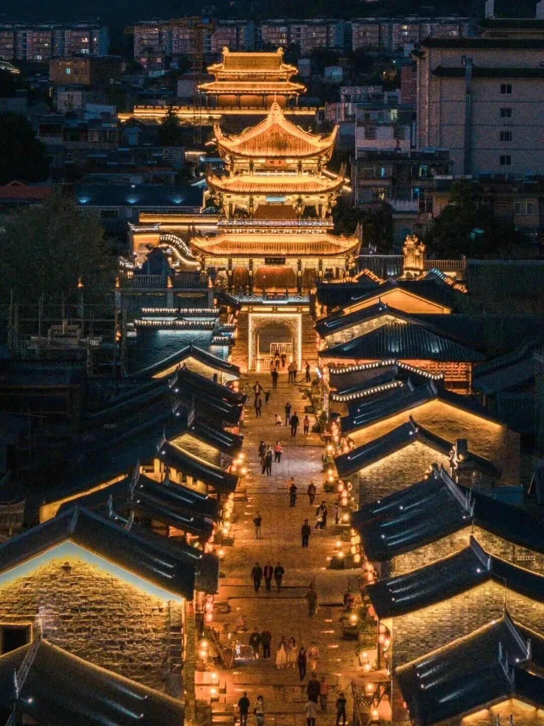 明朝时期的卫城在阳光下呈暖赭色,东边安定门与北边建平门对望,形成600m的中轴线,古街两侧木构青瓦屋,前店后坊格局保留完整。夜幕降临时,灯笼与彝族查尔瓦一起被风吹起。