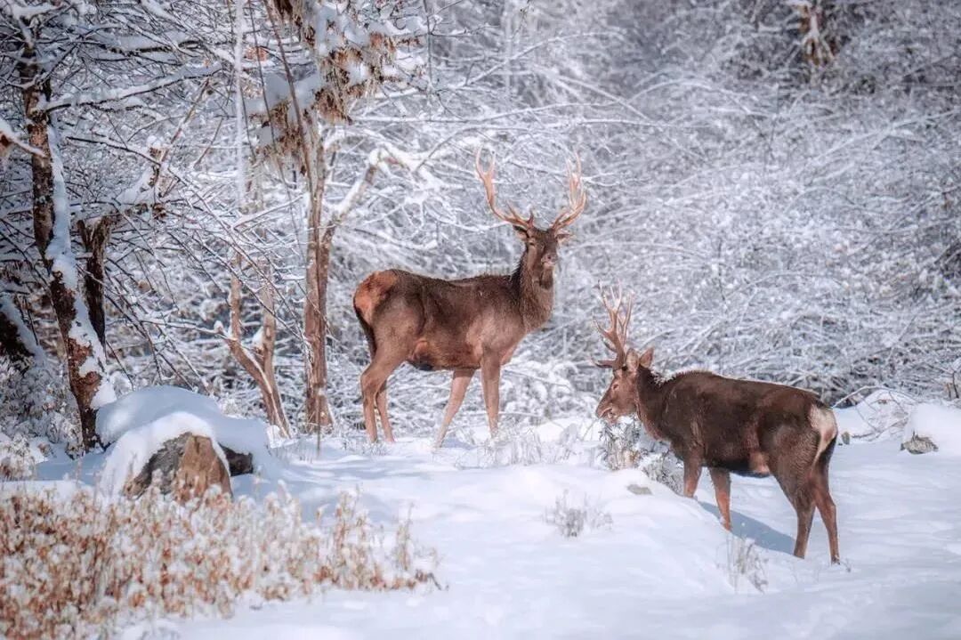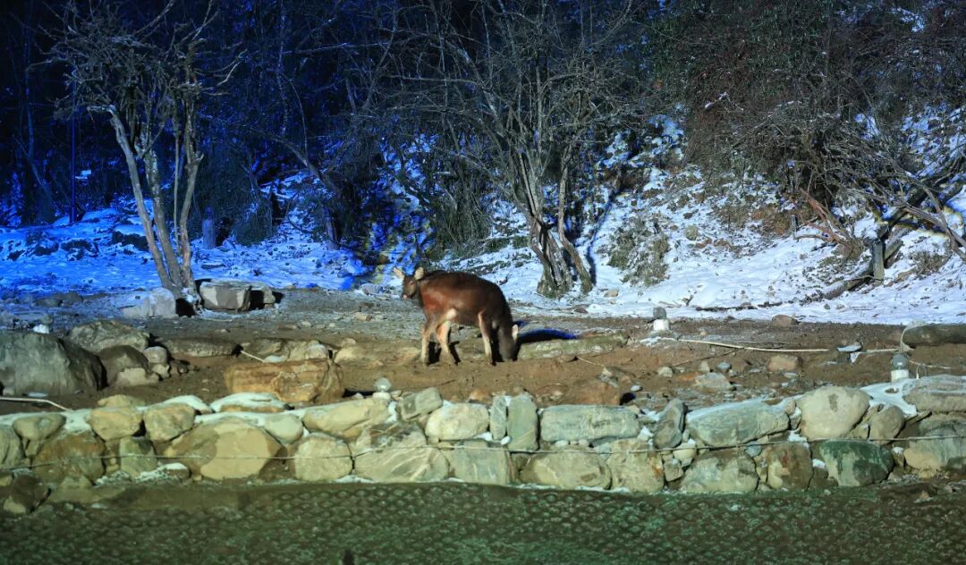 喇叭河有各类可爱的森林动物,在这雪国里安度冬日,坐在那儿仿若检察官的藏酋猴,感受到镜头转过身子一脸懵懂的野鹿,它们蹦跶在山间,于洁白的雪上留下一串串脚印。