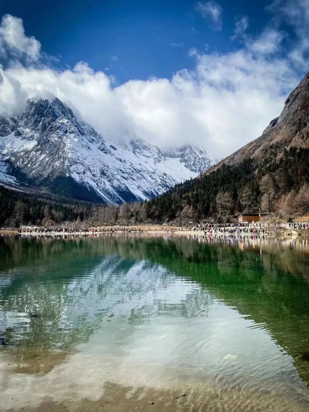 与鹧鸪山的热闹与躁动不大一样,来毕棚沟看雪,可能更多的“修行”,秋天的彩林此刻被白雪覆盖,清透的湖面在天空的照耀下更加湛蓝,红石滩的积雪在雪山的映衬下有着丰富的色彩。