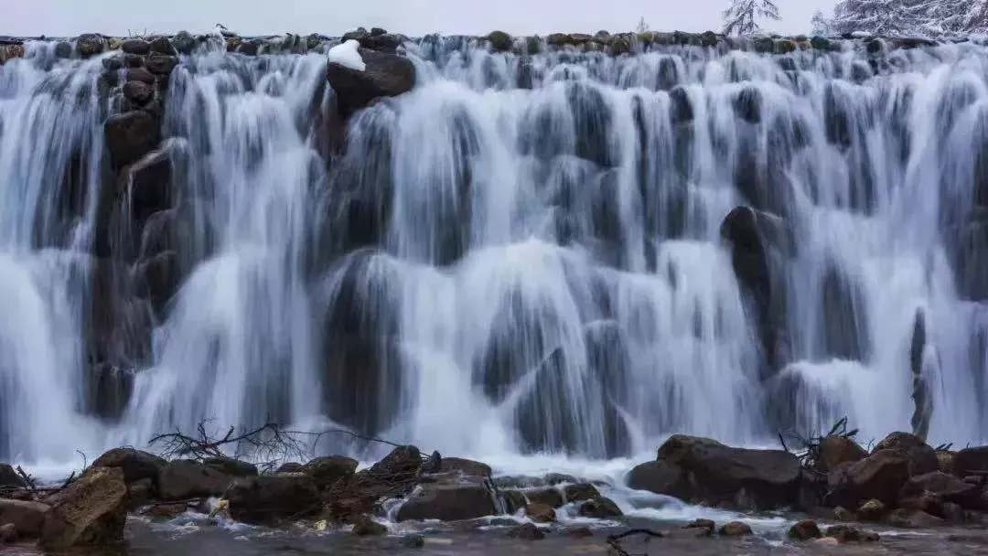 水面结成薄冰,秋天时它彩林与湖泊交相辉映,整个画面美得像一幅精心绘制的画作,冬天就变成了“怪树林立”,石墩积雪如猛兽的奇异景象,像是在搞一种很新的行为艺术。