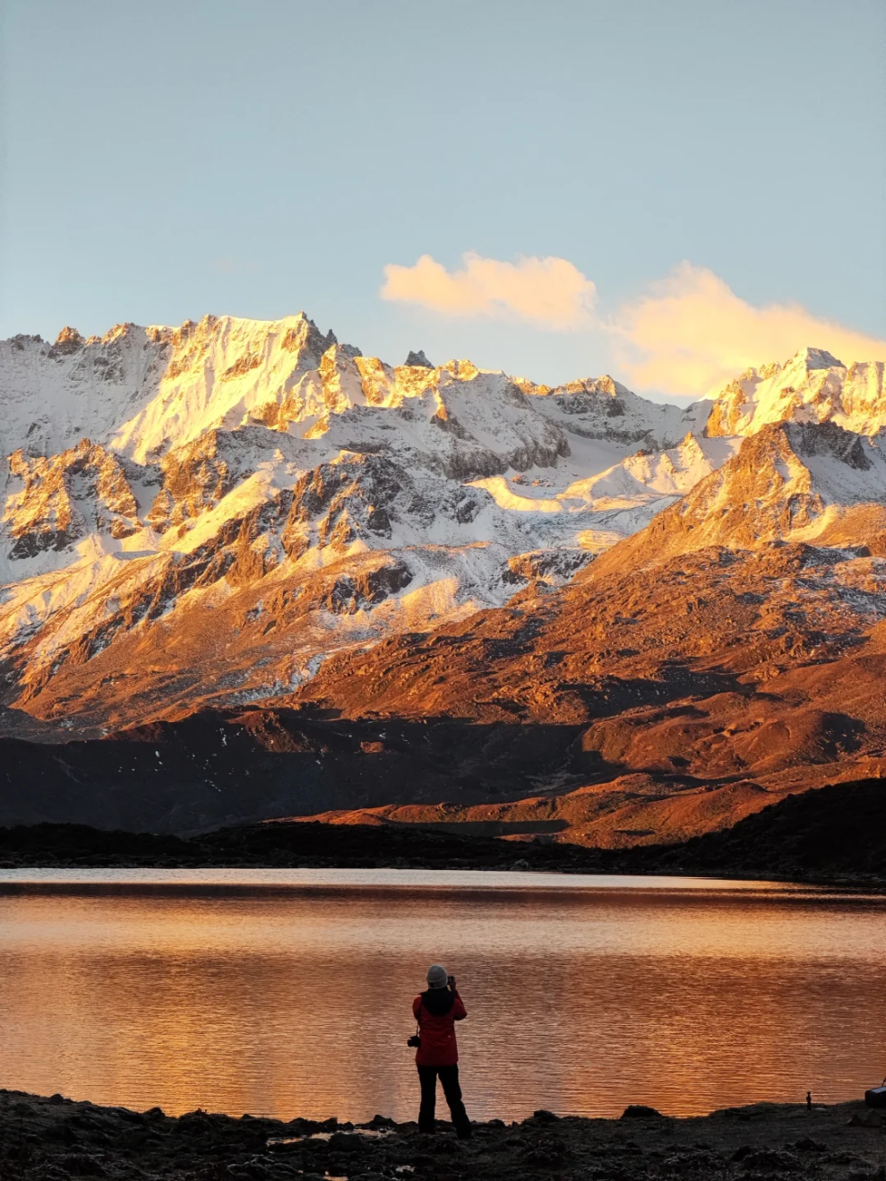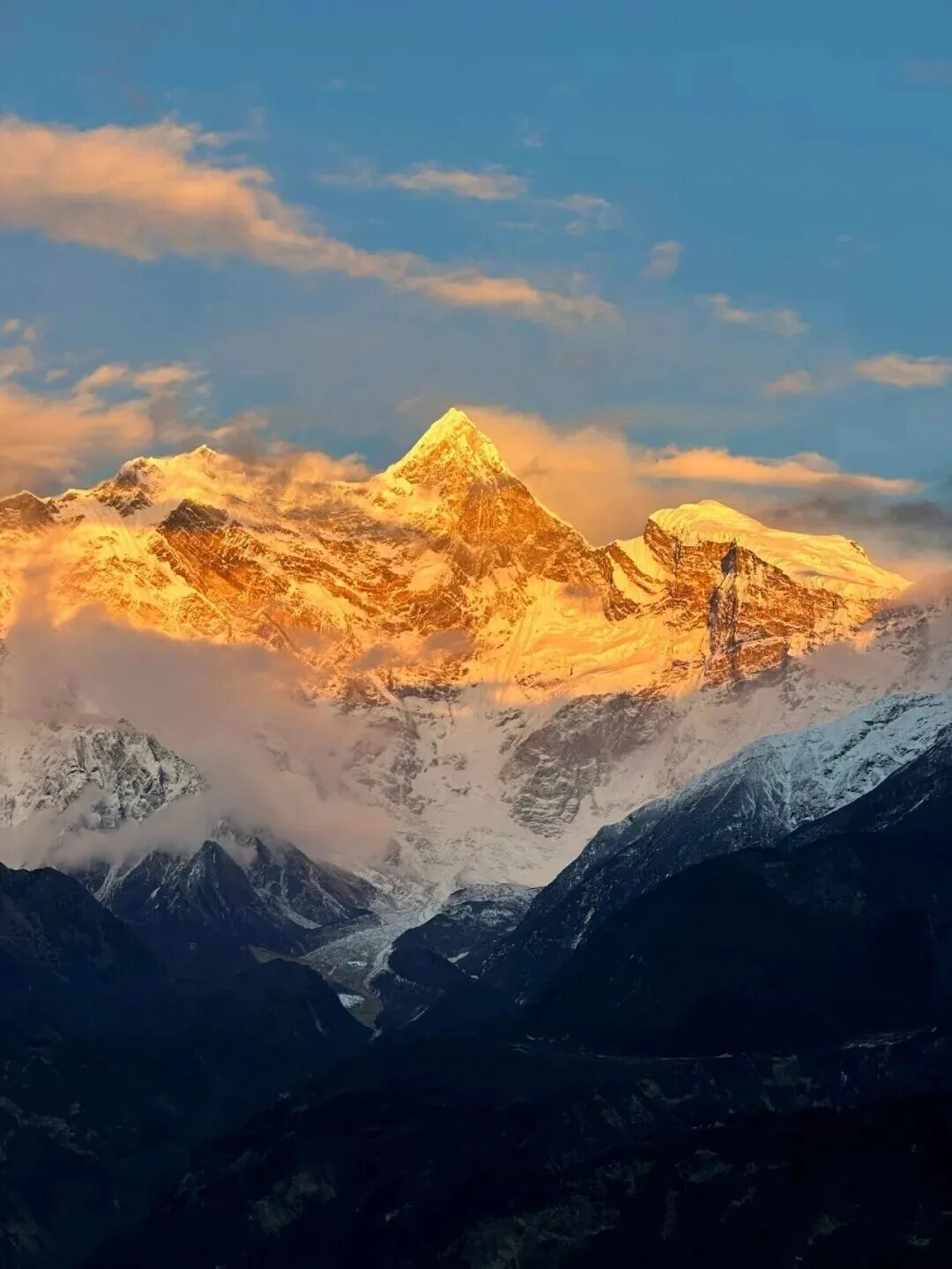清晨七点整,第一缕阳光越过贡嘎主峰,山体瞬间被镀成金色,像有人在雪山之巅点燃巨大的火把。海面如镜,把鎏金天空原封不动地复制下来,天地对称,让人分不清哪边是真哪边是影。