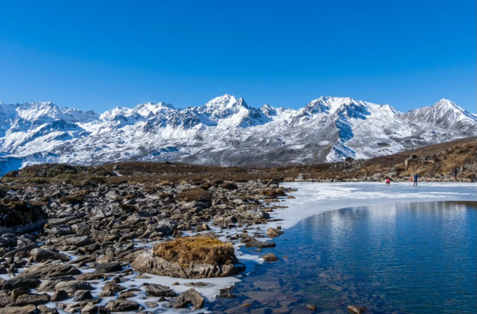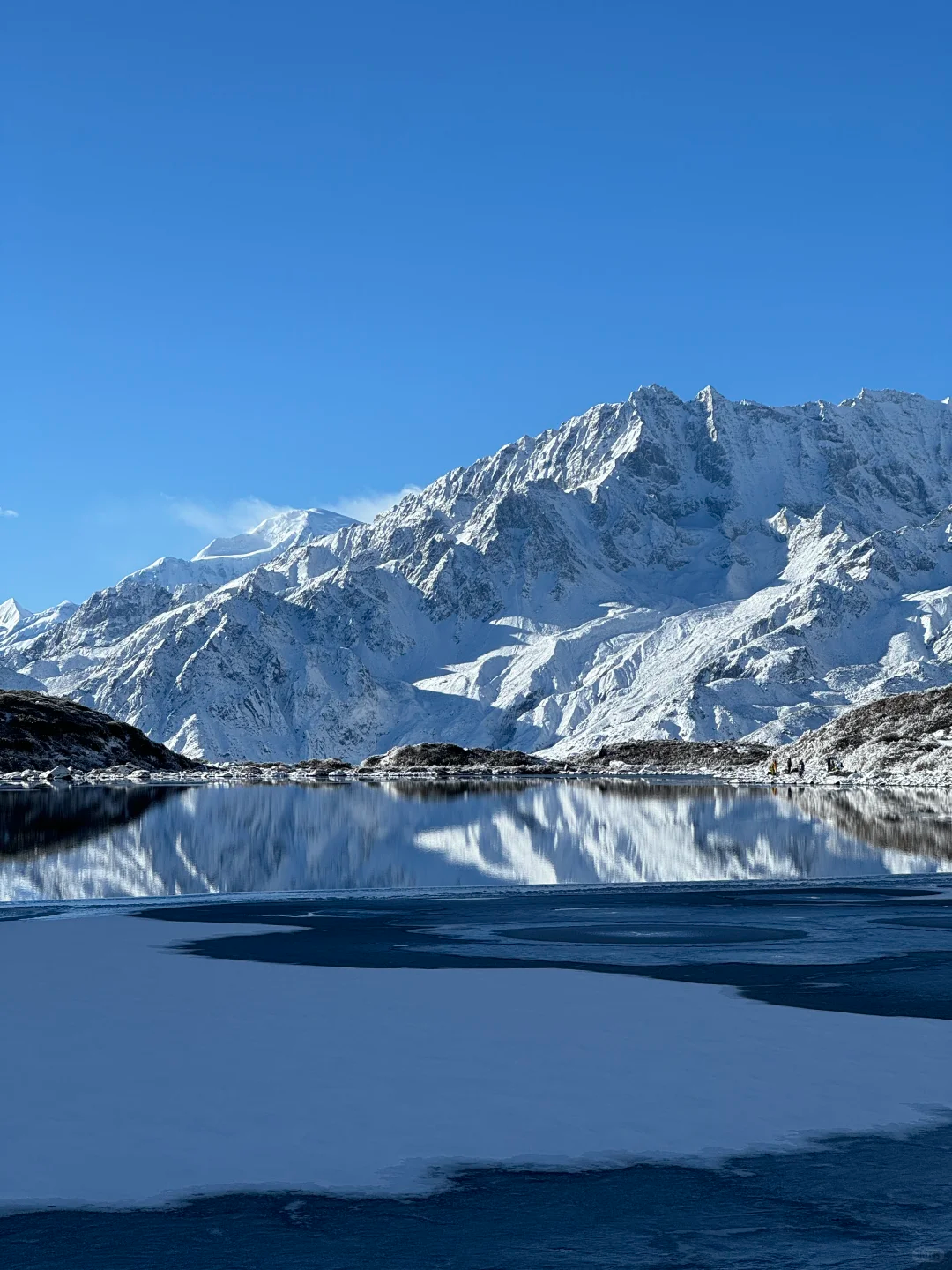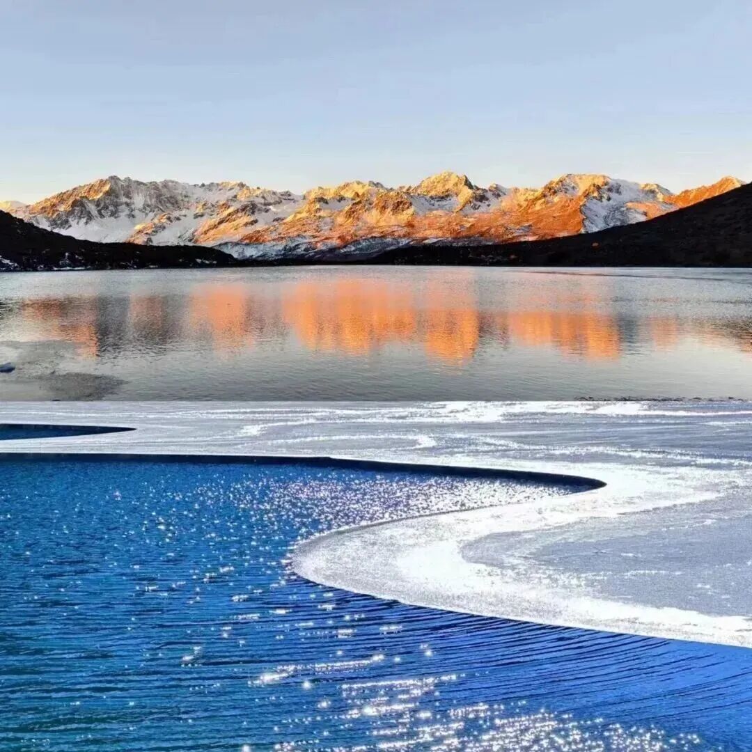 海面结冰,冰层被风磨得透亮,阳光一照,折射出深浅不一的幽蓝,像一块被岁月打磨的蓝宝石。俯身触摸,冰凉瞬间顺指尖爬上手背,却舍不得松手——这是贡嘎雪山万年前留下的呼吸。