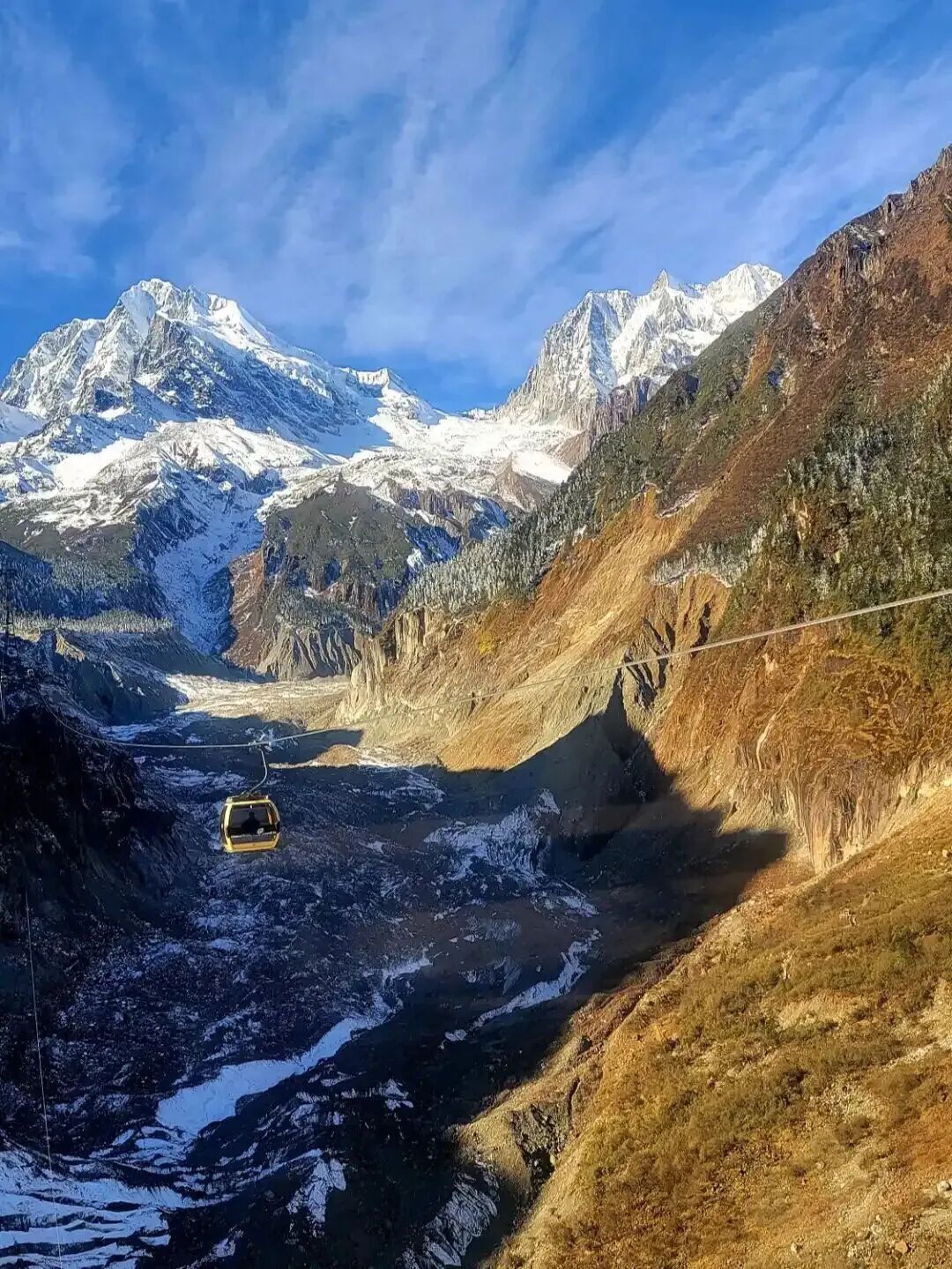 索道上行,冰体呈幽蓝色,裂隙像被岁月雕刻的纹理,阳光一照,折射出深浅不一的蓝,像一块被风磨亮的宝石。俯身触摸,冰凉瞬间顺指尖爬上手背,仿佛贡嘎雪山万年前留下的呼吸。