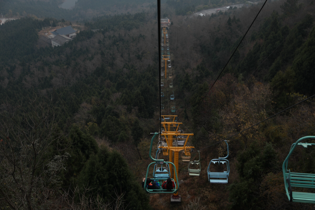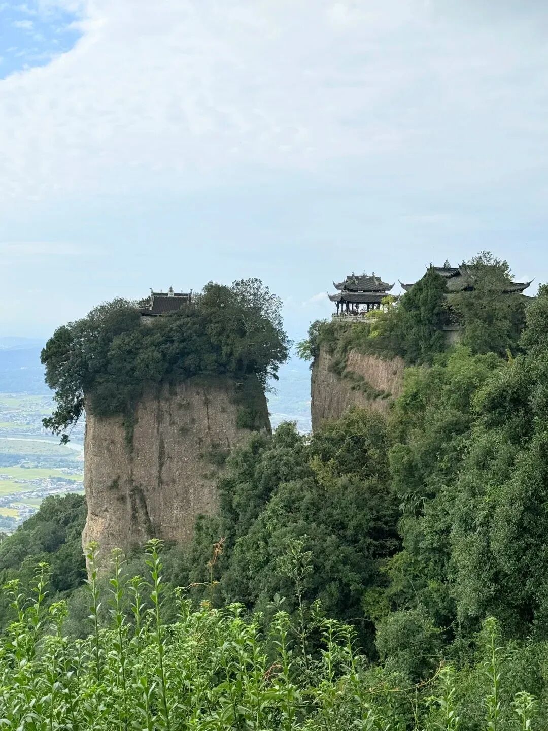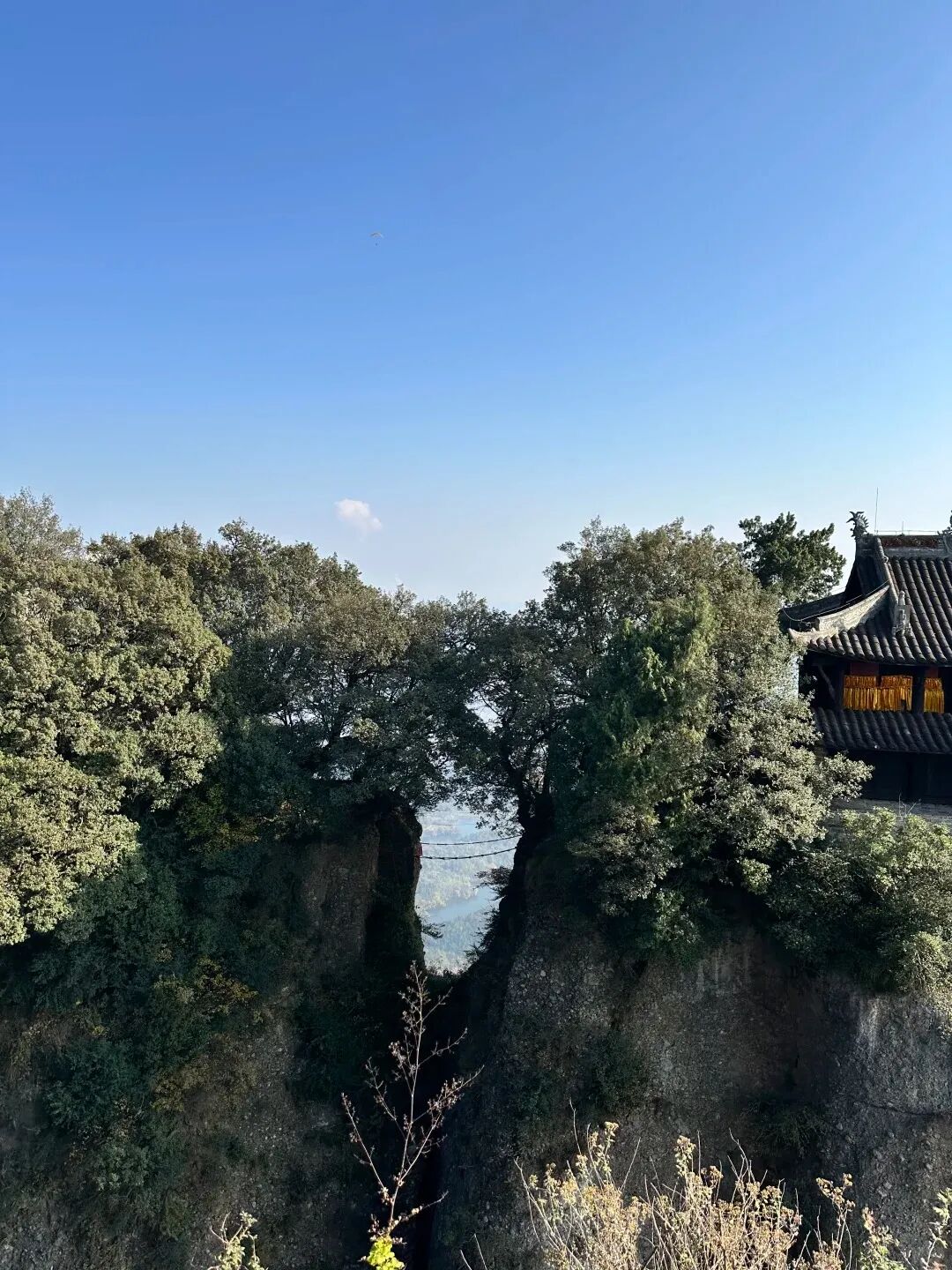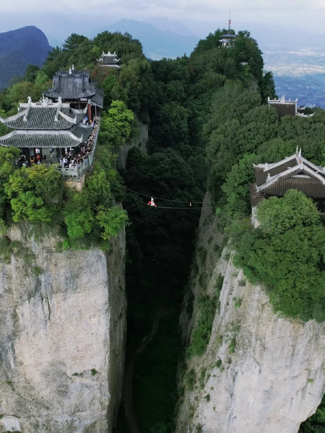 风景区内峭壁林立,森林环绕,险峻之势现于眼前。两座山峰伫立天地之间,两峰之间有索道,两峰之上有庙宇横陈,远看只觉自然之妙,堪称鬼斧神工!