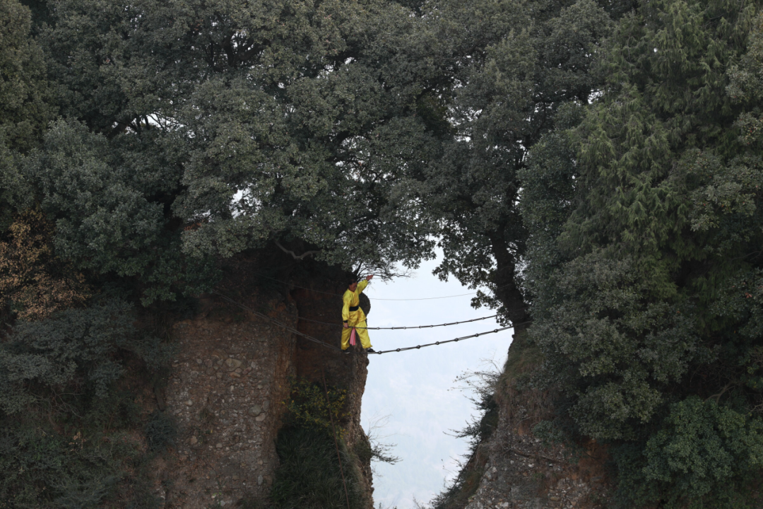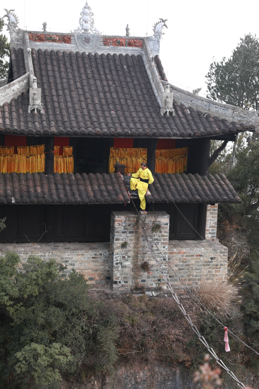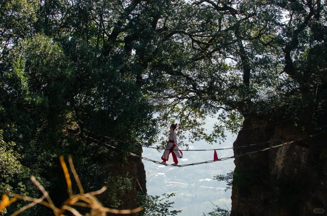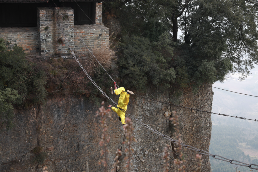在窦团山悬崖之间,绝技表演与铁索飞渡震撼上演。表演者立于高空铁索之上,脚下是深谷万丈,身形随山风起伏,却依然步伐稳健、动作利落