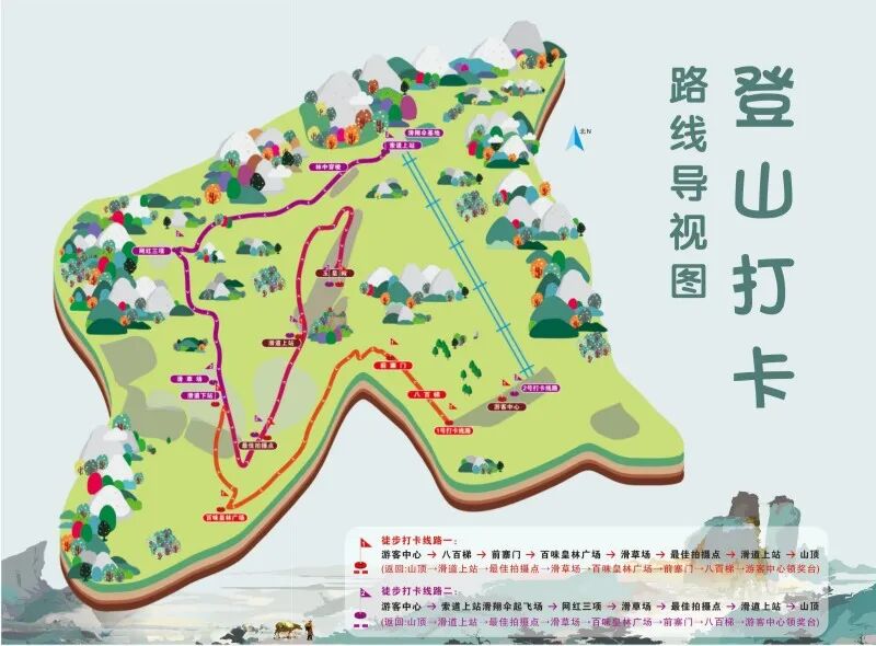 打卡线路如下:八百梯徒步线路:游客中心✅--八百梯游步道✅--前寨门✅--百味皇林广场✅--滑草场打卡点✅--云岩寺最佳拍摄点✅--滑道上站✅铁索飞渡超然亭山顶✅--返回至游客中心索道登山线路:游客中心✅--索道上站滑翔伞起飞场✅--网红三项游乐区✅--滑草场打卡点✅--云岩寺最佳拍摄点✅--滑道上站✅--铁索飞渡超然亭山顶✅--返回至游客中心